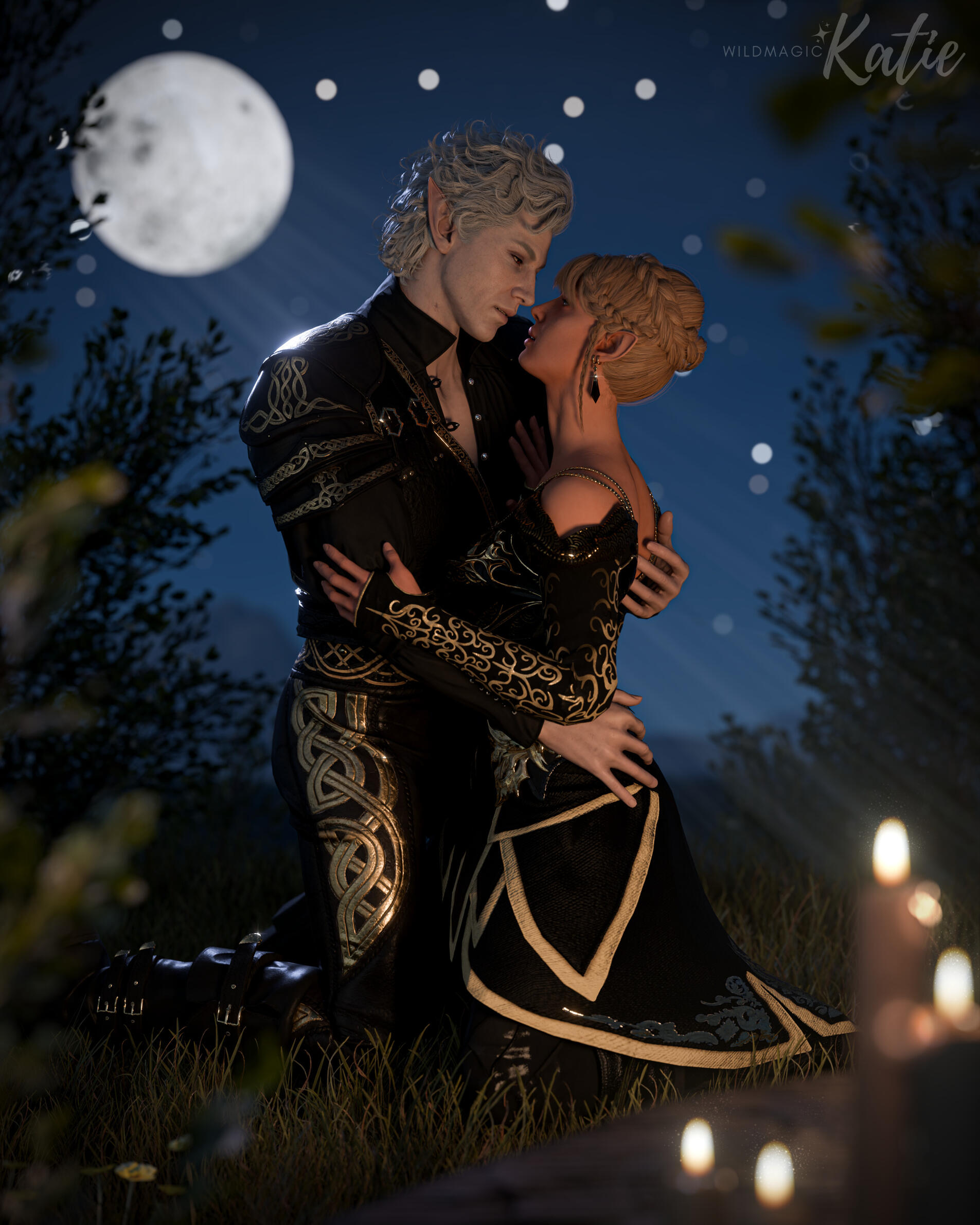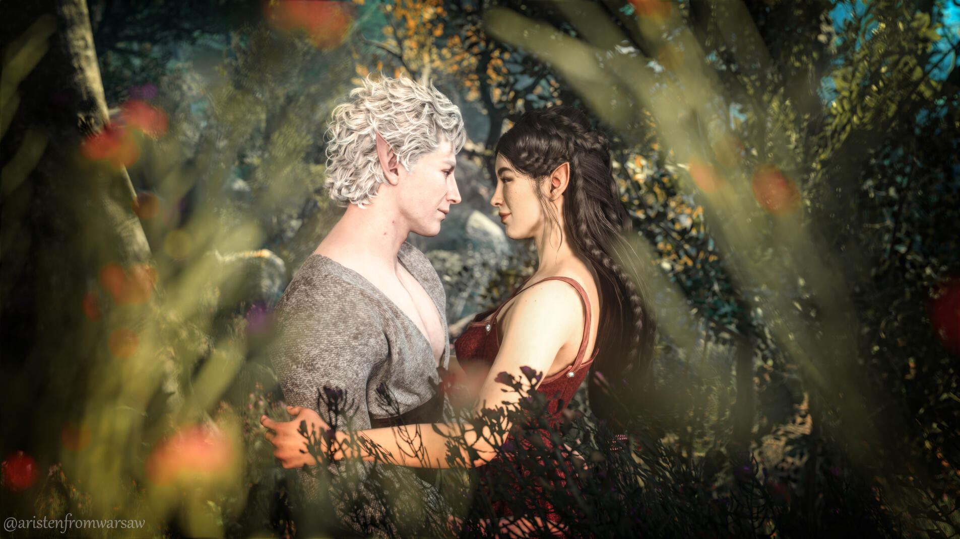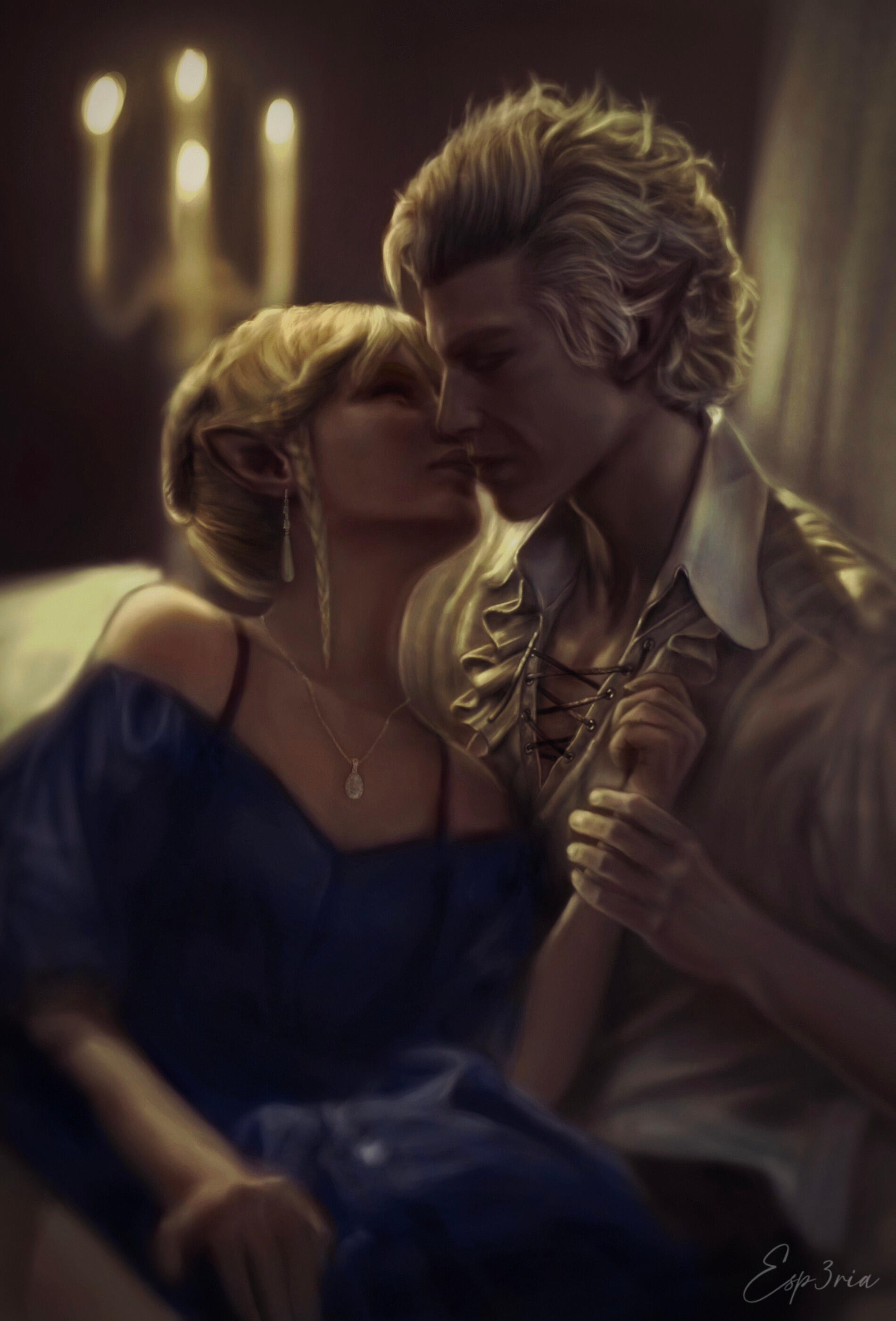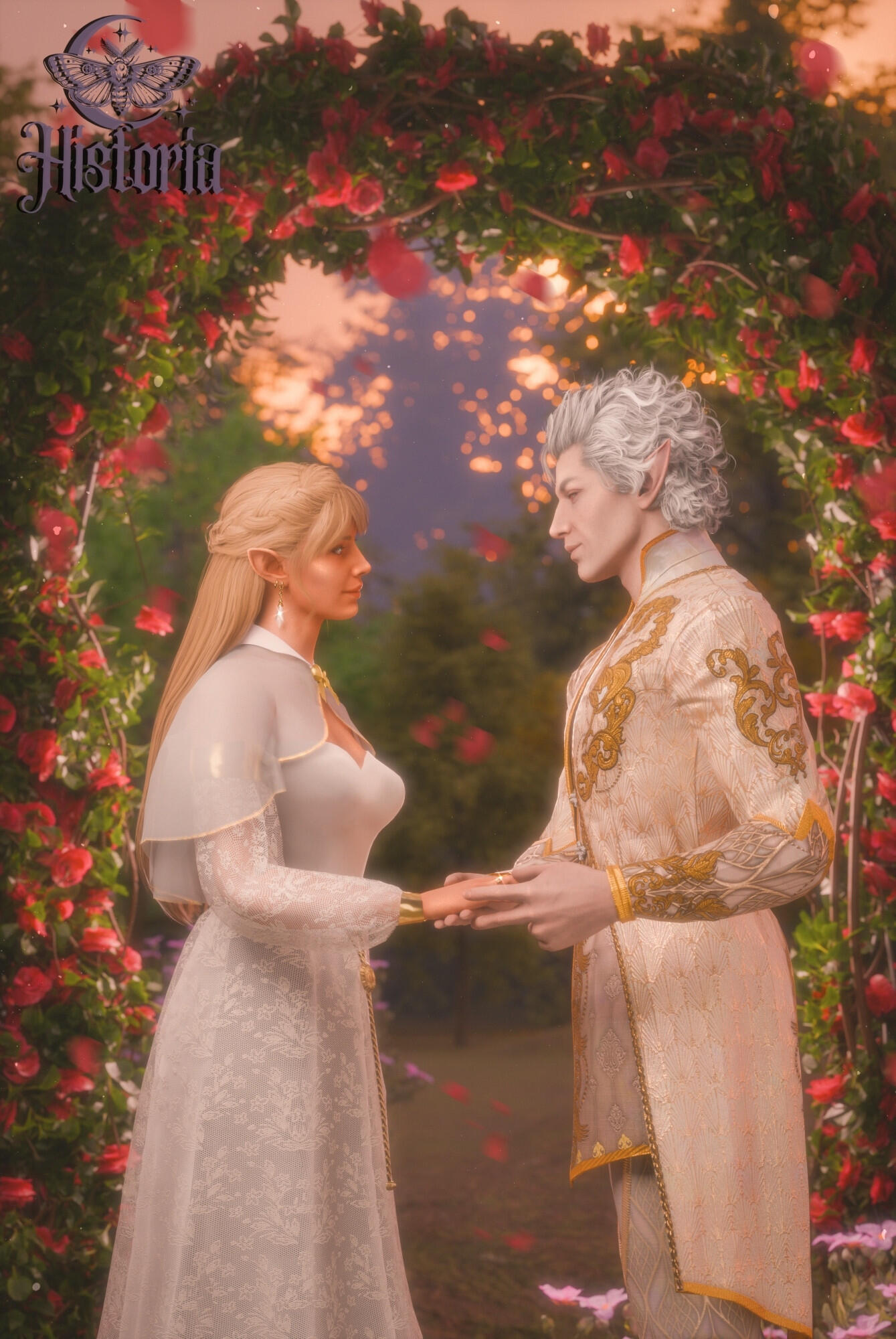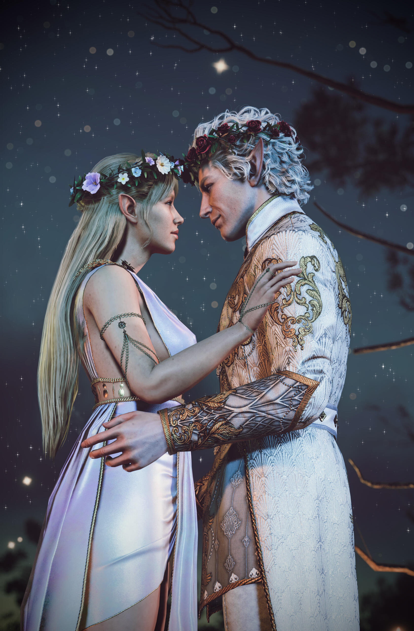 She also remembered the man who contributed to all her tragedy - Elwyn. She remembered how he feigned love for her and he did it all of his own free will for financial gain. She hated this man in few seconds.Aristen and Astarion stayed in the village for a while and moved on to find a way to protect Astarion from the sun. They also had a new companion, Fiona (Aristen's younger sister) who wanted to see some of the world. To have money for the trip, the three of them took various jobs. Sometimes they were mercenaries, sometimes they were doing small jobs or hunting bandits. Fiona also performed in inns, as she was a bard.After a long time and reading dozens of old books and scrolls, Aristen, in an old, forgotten temple in the middle of nowhere, found an enchanted pendant that allowed Astarion to enjoy the sun again after many years. However, all three of them continued their traveling lifestyle.One night Aristen and Astarion were lying on the grass and watching the stars. Then Ari suggested to her beloved one that they maybe return permanently to Baldur's Gate and start a simple, city life. He agreed and asked if she would become his wife. Aristen was surprised, despite spending so many years by Astarion's side, she was afraid that one day he would leave her. She still considered herself a monster, even though she had cut herself off from her father many years ago. Aristen was always afraid that she would somehow become a bloodthirsty murderer again. And Astarion could have almost any woman - she had seen more than once how lustfully ladies looked at him. But he chose her and wants to be with her forever.The wedding took place in her native village. Her entire family and friends celebrated one of the most beautiful days of her life.