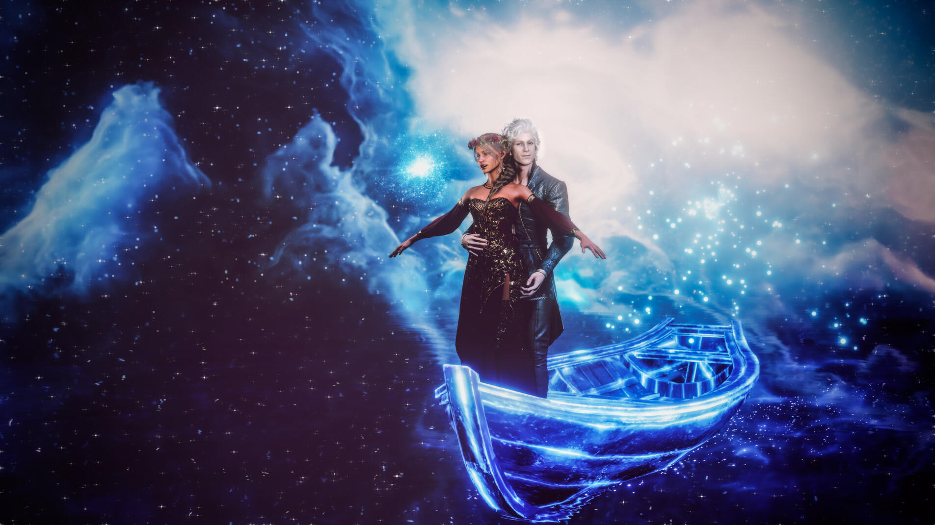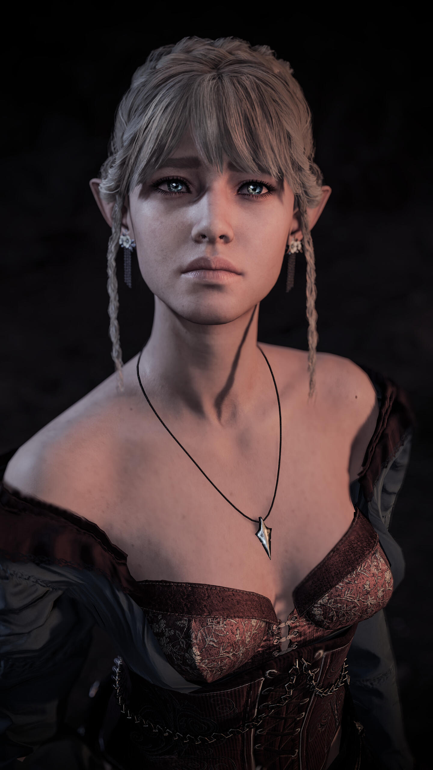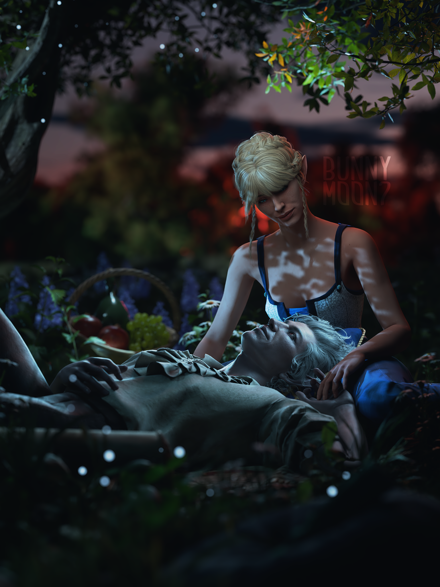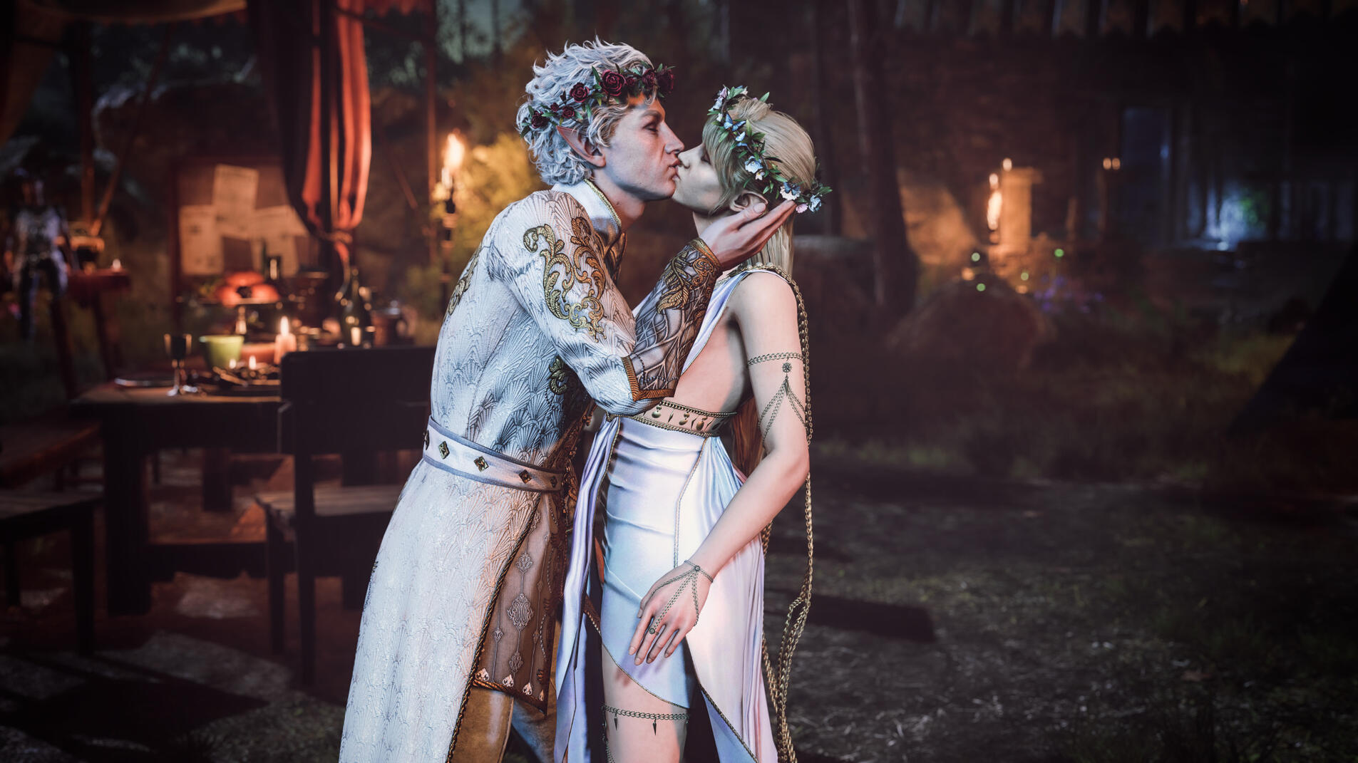 She also remembered the man who contributed to all her tragedy - Elwyn. She remembered how he feigned love for her and he did it all of his own free will for financial gain. She hated this man in few seconds.Aristen and Astarion stayed in the village for a while and moved on to find a way to protect Astarion from the sun. They also had a new companion, Fiona (Aristen's younger sister) who wanted to see some of the world. To have money for the trip, the three of them took various jobs. Sometimes they were mercenaries, sometimes they were doing small jobs or hunting bandits. Fiona also performed in inns, as she was a bard.After a long time and reading dozens of old books and scrolls, Aristen, in an old, forgotten temple in the middle of nowhere, found an enchanted pendant that allowed Astarion to enjoy the sun again after many years. However, all three of them continued their traveling lifestyle.One night Aristen and Astarion were lying on the grass and watching the stars. Then Ari suggested to her beloved one that they maybe return permanently to Baldur's Gate and start a simple, city life. He agreed and asked if she would become his wife. Aristen was surprised, despite spending so many years by Astarion's side, she was afraid that one day he would leave her. She still considered herself a monster, even though she had cut herself off from her father many years ago. Aristen was always afraid that she would somehow become a bloodthirsty murderer again. And Astarion could have almost any woman - she had seen more than once how lustfully ladies looked at him. But he chose her and wants to be with her forever.The wedding took place in her native village. Her entire family and friends celebrated one of the most beautiful days of her life.
