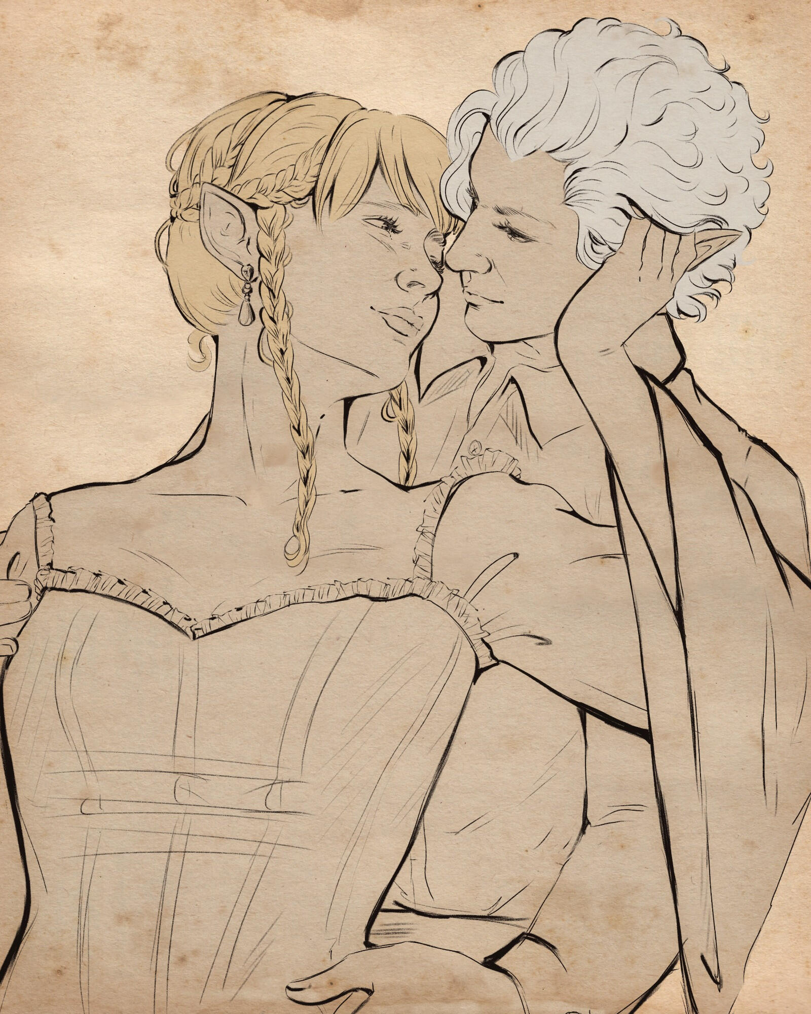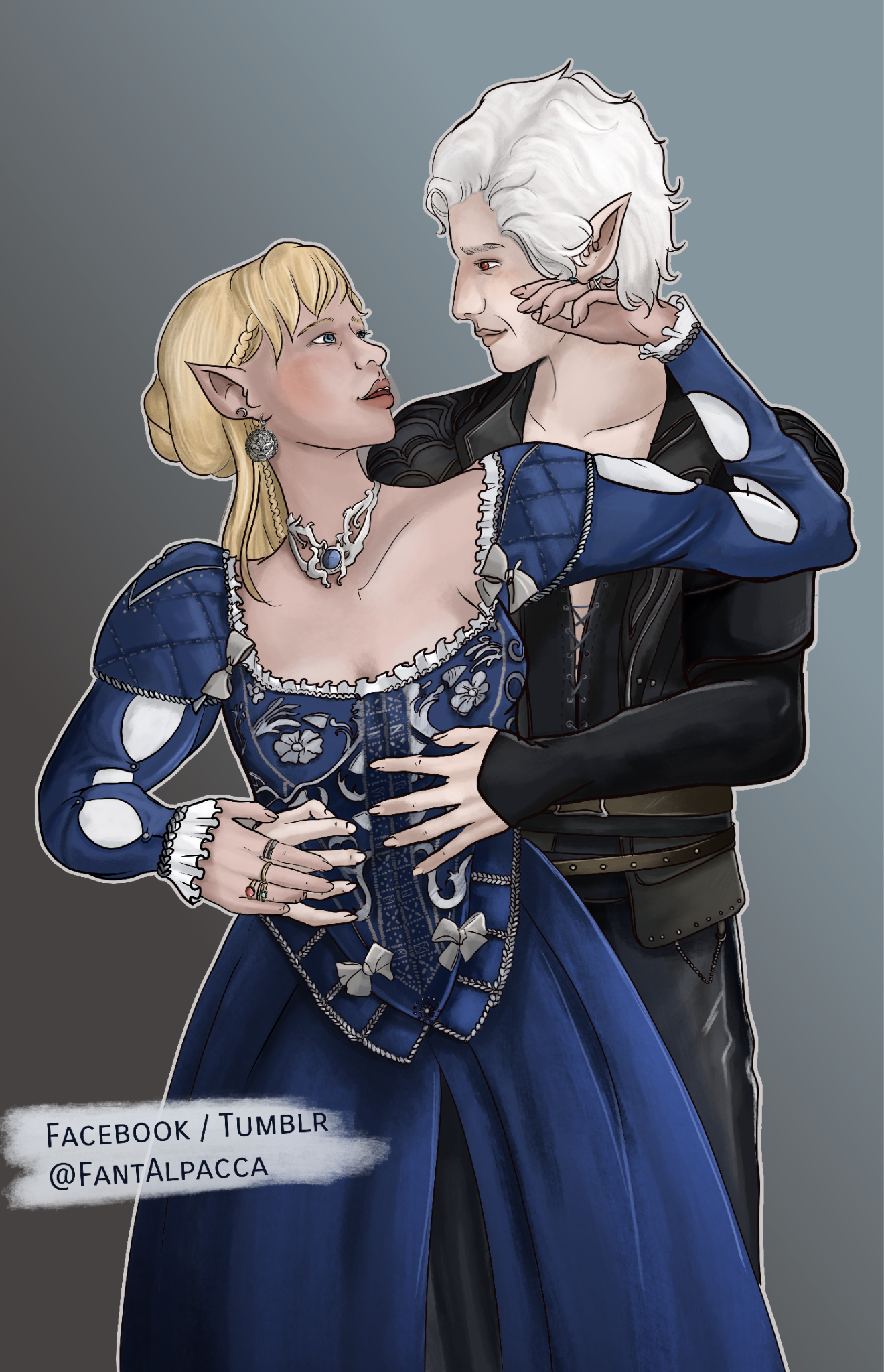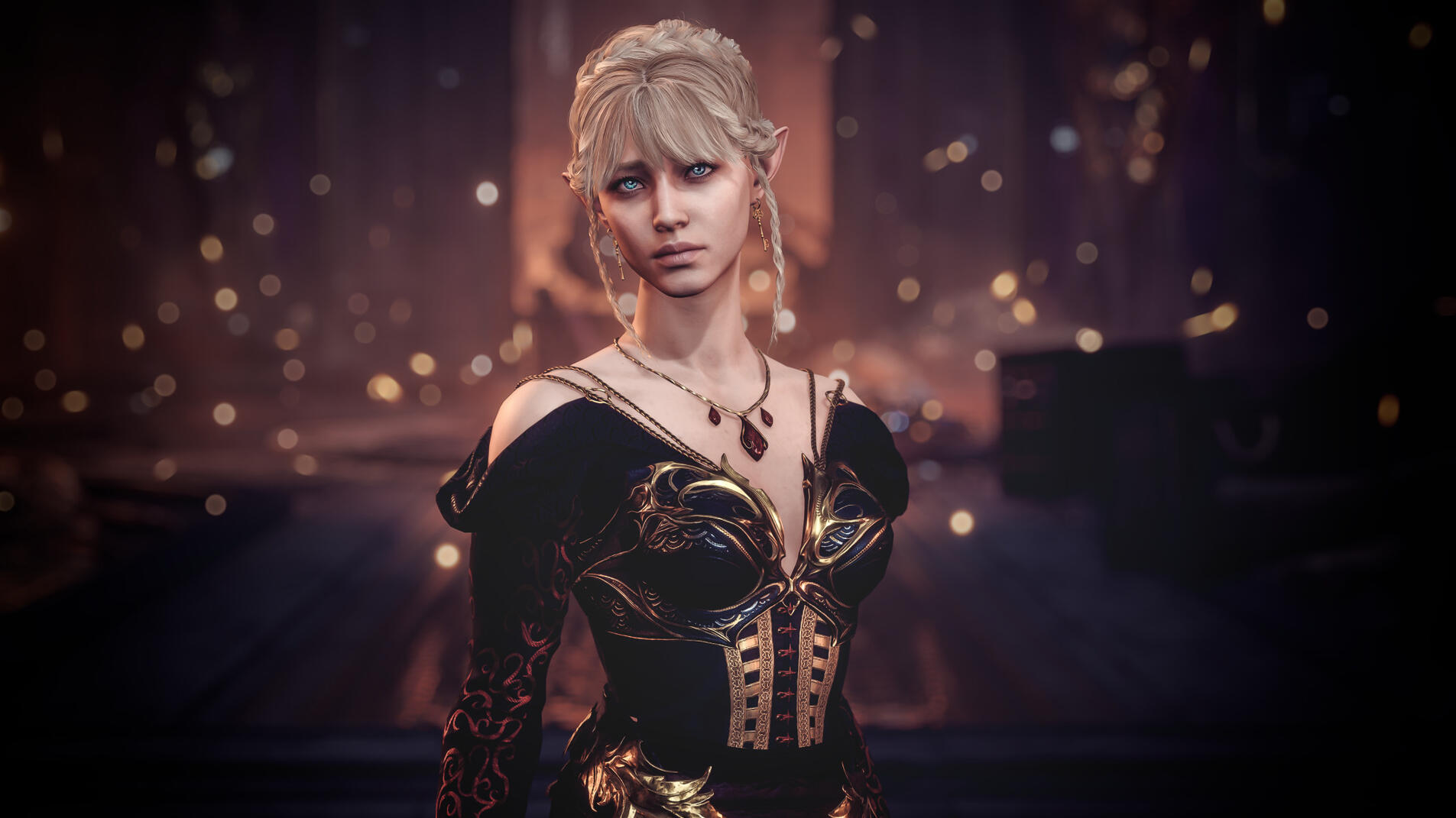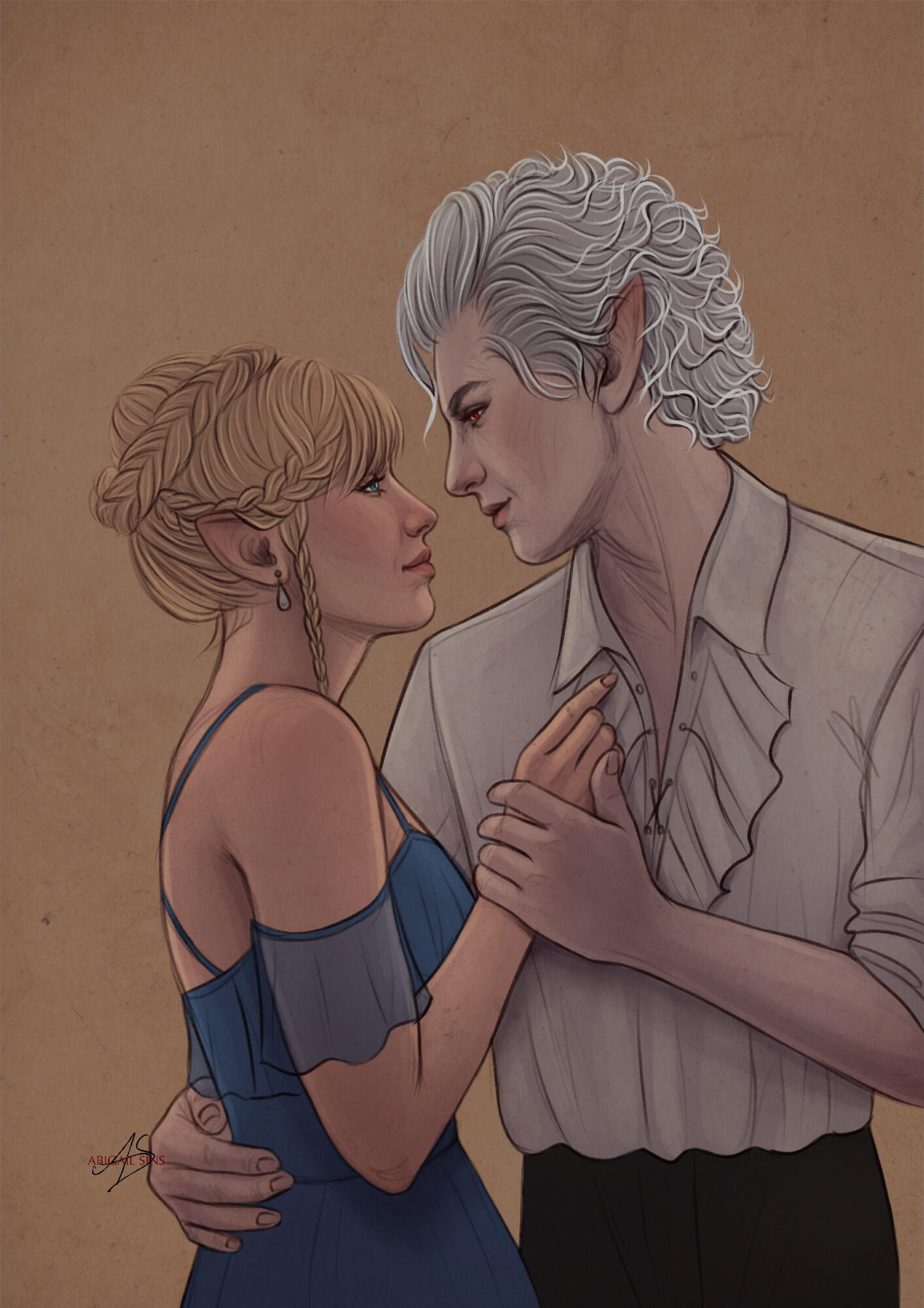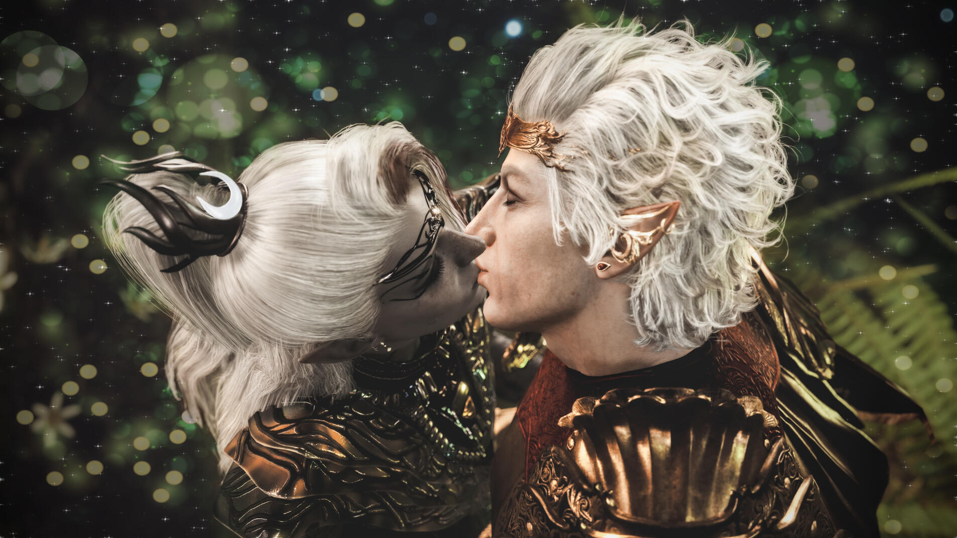She also remembered the man who contributed to all her tragedy - Elwyn. She remembered how he feigned love for her and he did it all of his own free will for financial gain. She hated this man in few seconds.Aristen and Astarion stayed in the village for a while and moved on to find a way to protect Astarion from the sun. They also had a new companion, Fiona (Aristen's younger sister) who wanted to see some of the world. To have money for the trip, the three of them took various jobs. Sometimes they were mercenaries, sometimes they were doing small jobs or hunting bandits. Fiona also performed in inns, as she was a bard.After a long time and reading dozens of old books and scrolls, Aristen, in an old, forgotten temple in the middle of nowhere, found an enchanted pendant that allowed Astarion to enjoy the sun again after many years. However, all three of them continued their traveling lifestyle.One night Aristen and Astarion were lying on the grass and watching the stars. Then Ari suggested to her beloved one that they maybe return permanently to Baldur's Gate and start a simple, city life. He agreed and asked if she would become his wife. Aristen was surprised, despite spending so many years by Astarion's side, she was afraid that one day he would leave her. She still considered herself a monster, even though she had cut herself off from her father many years ago. Aristen was always afraid that she would somehow become a bloodthirsty murderer again. And Astarion could have almost any woman - she had seen more than once how lustfully ladies looked at him. But he chose her and wants to be with her forever.The wedding took place in her native village. Her entire family and friends celebrated one of the most beautiful days of her life.