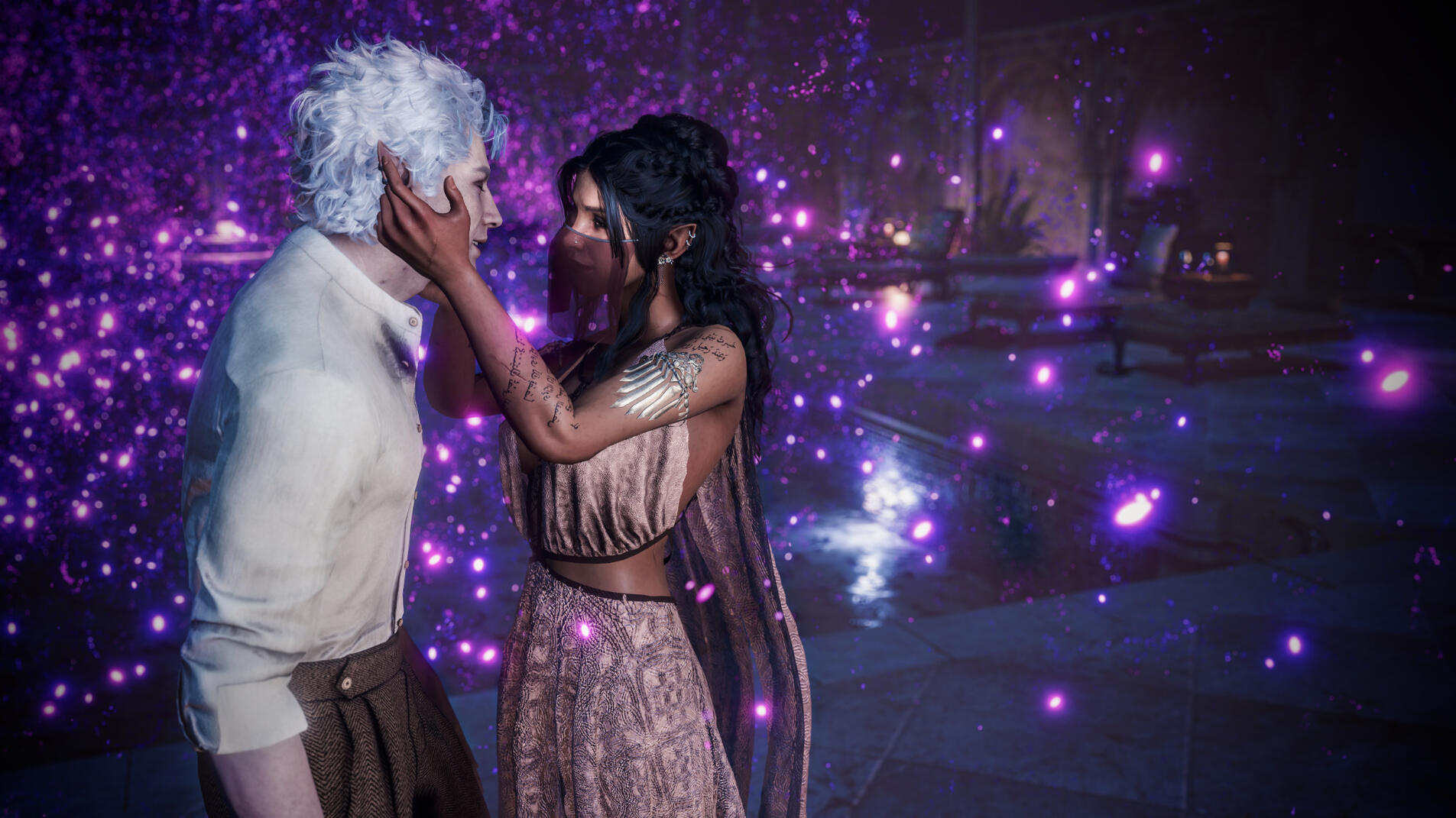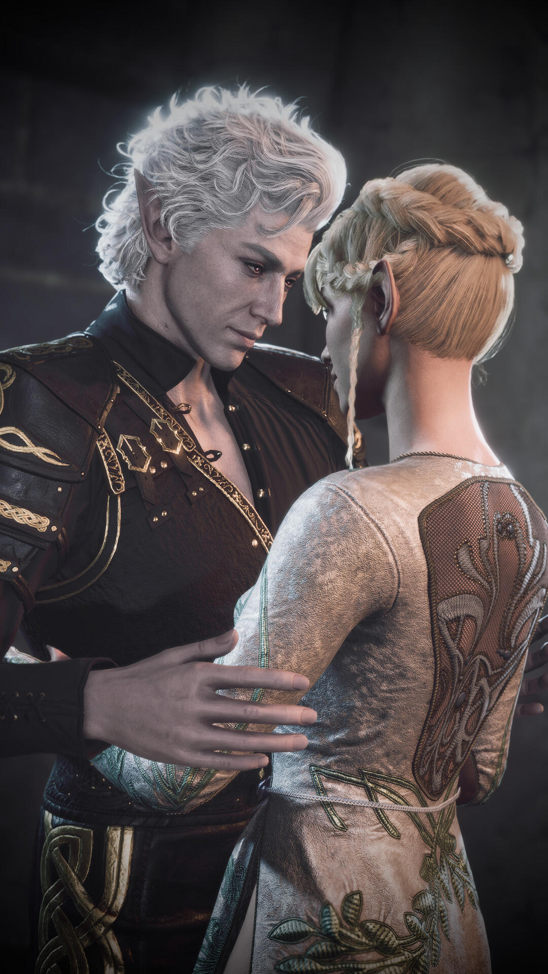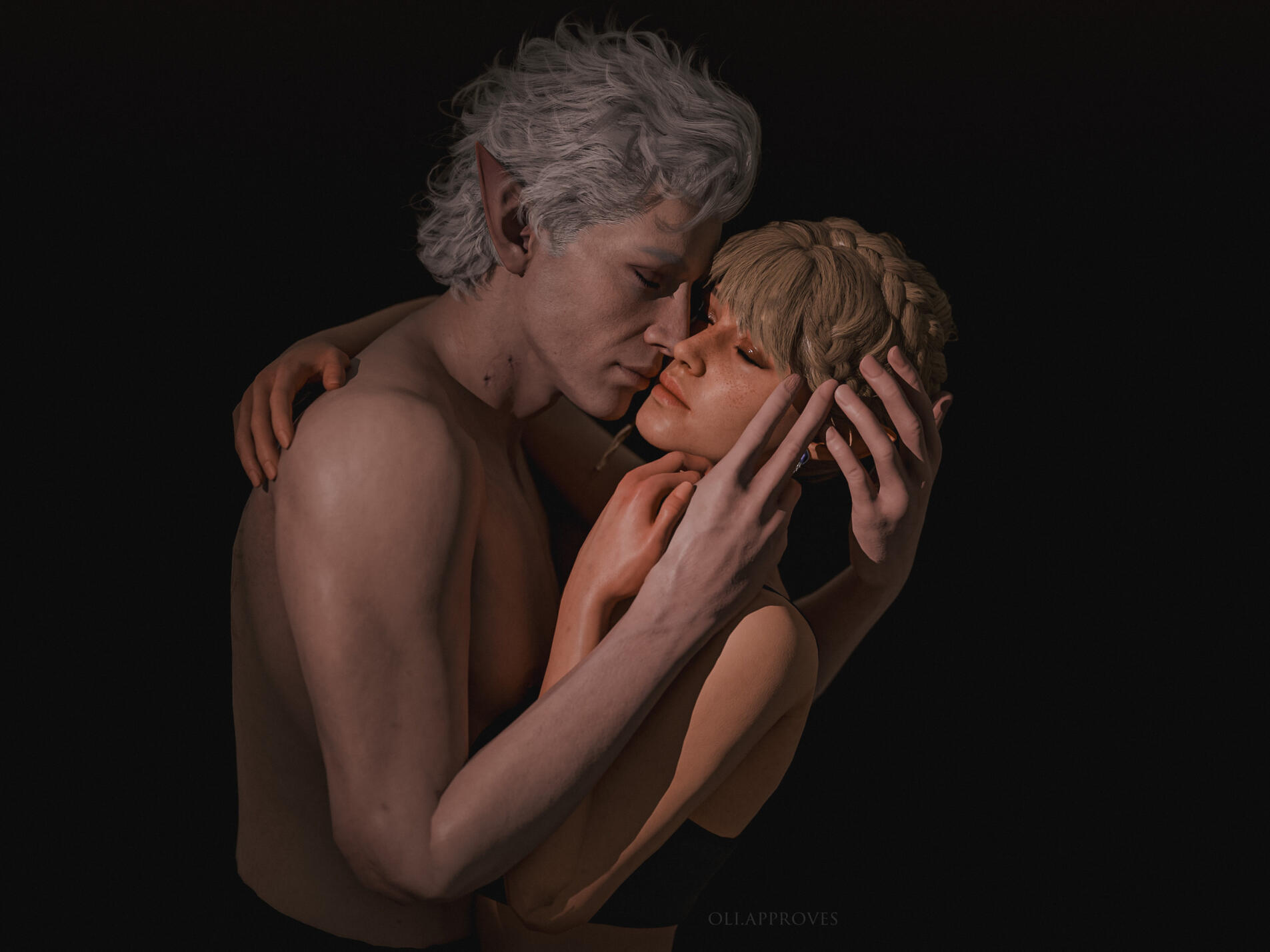 A new beginning (in-game events):Being a Bhaal's doll could have lasted for ages if not a certain incident. One day Aristen was kidnapped by a Mind Flayer's ship. She was infected with their tadpole and lost her memory. Luckily for her, there was a plane crash, which she miraculously survived and managed to escape. Now she had a new goal - to get rid of the tadpole and find out who she is. During her journey she learned the truth about her murderous origins. But she wasn't alone in this. Aristen met some loyal friends: Gale (a human wizard who was harmed by the goddess of magic, Mystra), Karlach (tiefling who, like Ari, was betrayed by the person she trusted), Lae'zel (githyanki who was deceived by her queen), Shadowheart (a priestess of Shar who rejected her goddess), Wyll (human Warlock who sacrificed a lot to save others), Halsin (an elf druid who likes to carve ducks from wood), Jaheira (half elf and High Harper) and Minsc (Jaheira's friend who considers his hamster to be his mentor). And even though everyone supported her, Aristen felt that they didn't fully understand her, they don't know what it means to be someone's puppet. Except for one person who had similar sins as her. A men who has been a plaything for the powerful vampire for over 200 years. That toy was Astarion, high elf, vampire spawn. At first, Aristen had mixed feelings towards him, but later she realized that they were two of a kind. He was the only one who truly understood her dark urge and he truly was not afraid of her. They fell in love with each other.One night the urge to kill become strong and Aristen had mighty desire to kill Astarion. Resisting her whisperings, she decided to do everything to save him. Aristen woke him up and asked him to tie her up. She felt that after such an incident the vampire would break up with her. Who would want a partner who could kill you in the middle of the night ? But no, Astarion didn't break up with her, he was with her all night, watching over her. He wasn't even mad at her. He didn't see her as a monster, but only as a normal person who had been wronged by fate - she saw him the same way. Thanks to Astarion, everything became easier and impossible things became possible.