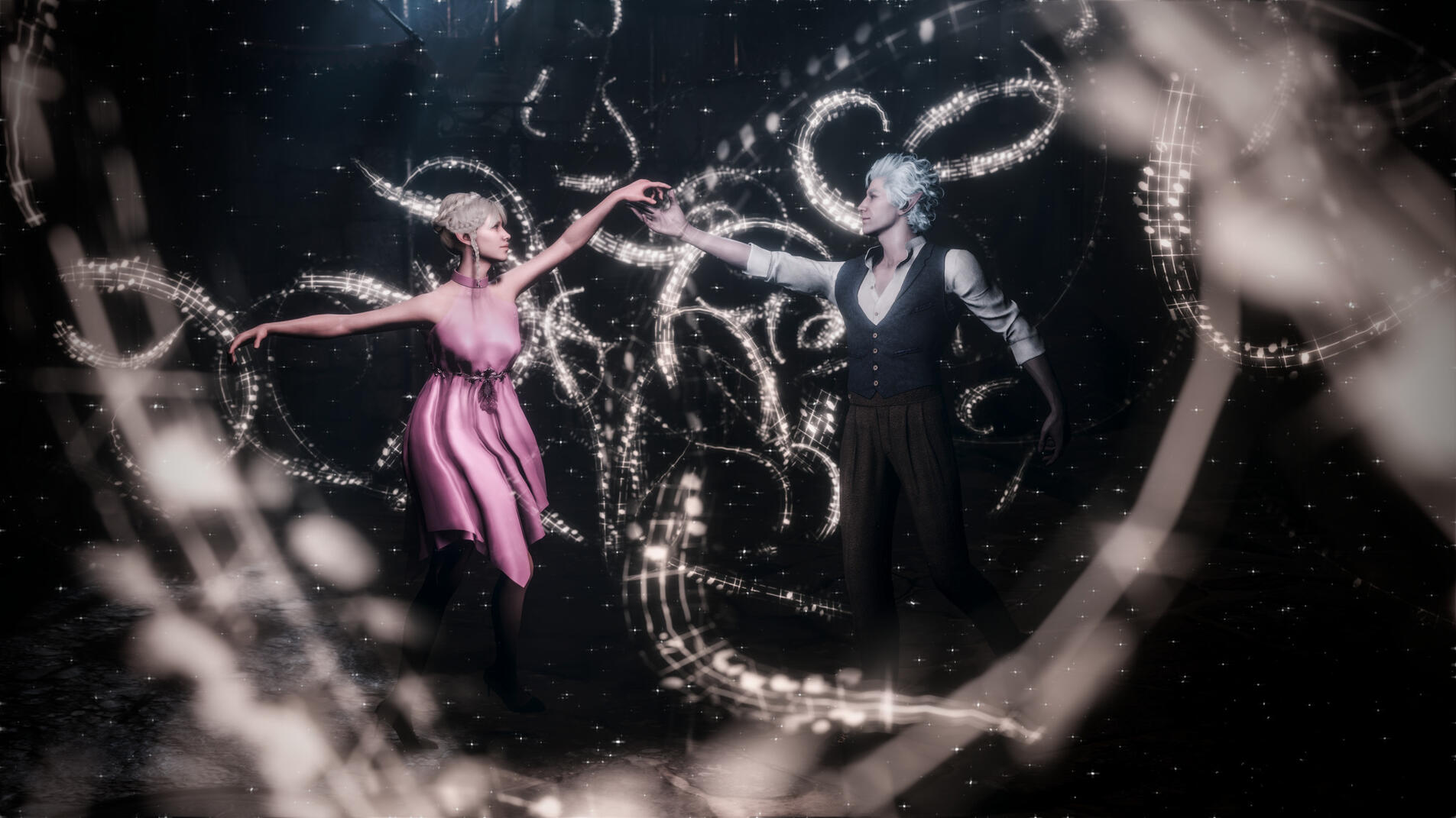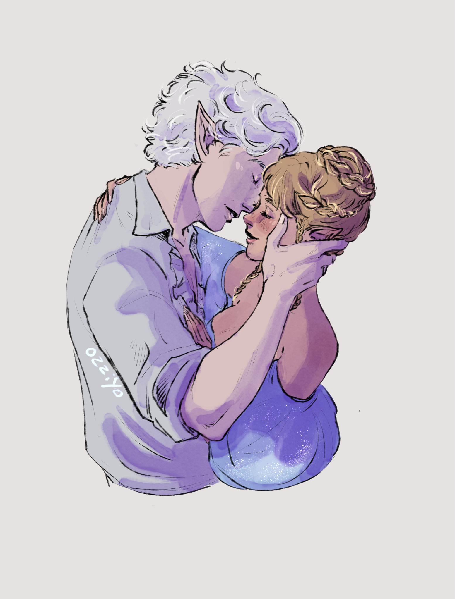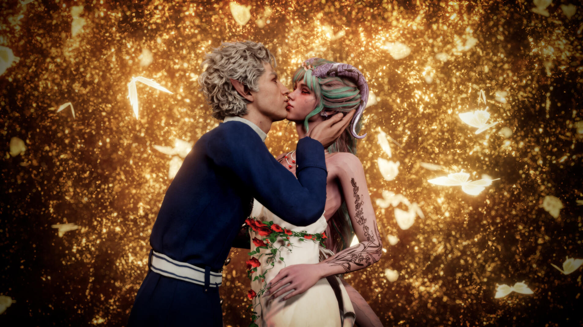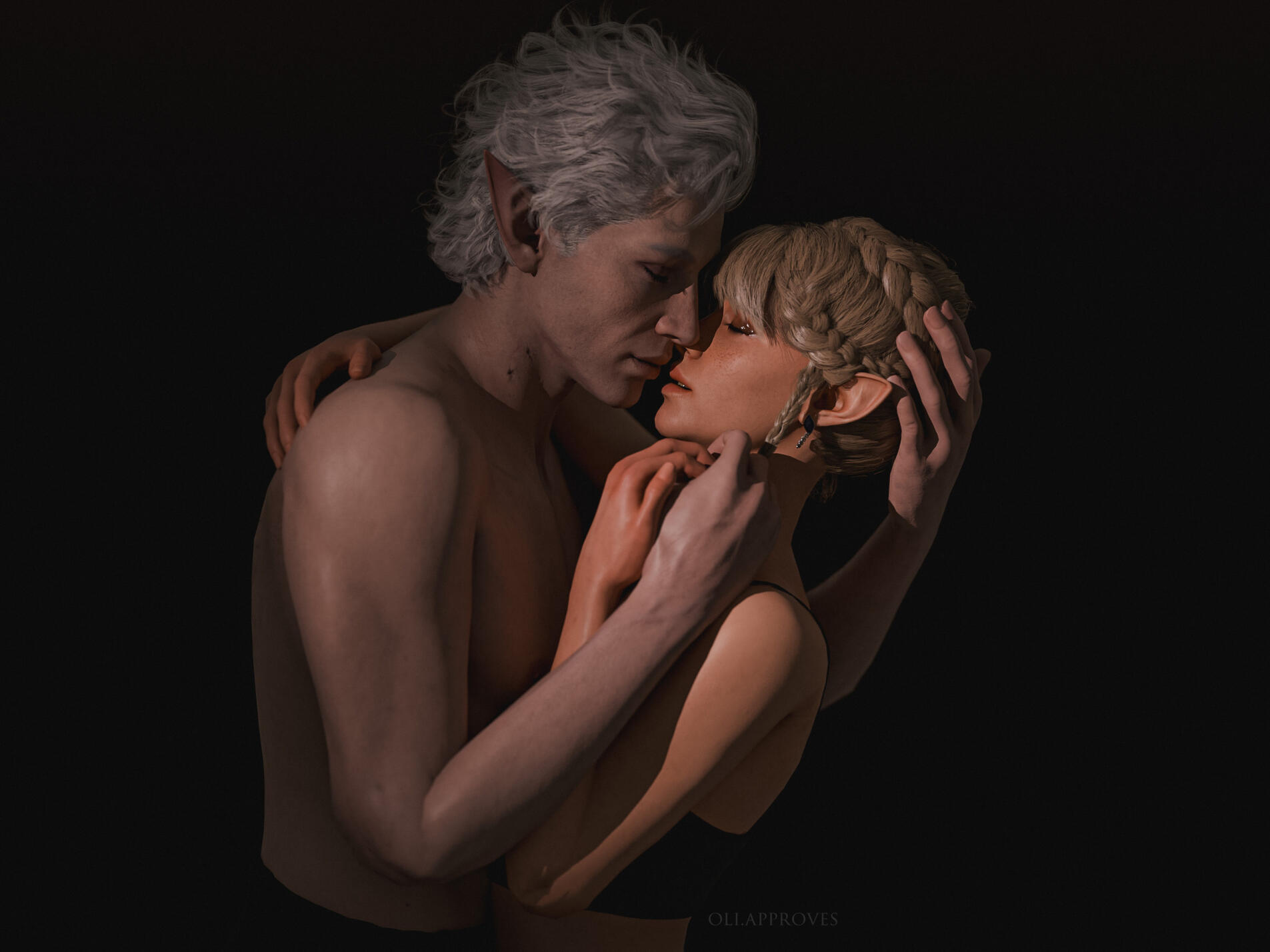 A new beginning (in-game events):Being a Bhaal's doll could have lasted for ages if not a certain incident. One day Aristen was kidnapped by a Mind Flayer's ship. She was infected with their tadpole and lost her memory. Luckily for her, there was a plane crash, which she miraculously survived and managed to escape. Now she had a new goal - to get rid of the tadpole and find out who she is. During her journey she learned the truth about her murderous origins. But she wasn't alone in this. Aristen met some loyal friends: Gale (a human wizard who was harmed by the goddess of magic, Mystra), Karlach (tiefling who, like Ari, was betrayed by the person she trusted), Lae'zel (githyanki who was deceived by her queen), Shadowheart (a priestess of Shar who rejected her goddess), Wyll (human Warlock who sacrificed a lot to save others), Halsin (an elf druid who likes to carve ducks from wood), Jaheira (half elf and High Harper) and Minsc (Jaheira's friend who considers his hamster to be his mentor). And even though everyone supported her, Aristen felt that they didn't fully understand her, they don't know what it means to be someone's puppet. Except for one person who had similar sins as her. A men who has been a plaything for the powerful vampire for over 200 years. That toy was Astarion, high elf, vampire spawn. At first, Aristen had mixed feelings towards him, but later she realized that they were two of a kind. He was the only one who truly understood her dark urge and he truly was not afraid of her. They fell in love with each other.One night the urge to kill become strong and Aristen had mighty desire to kill Astarion. Resisting her whisperings, she decided to do everything to save him. Aristen woke him up and asked him to tie her up. She felt that after such an incident the vampire would break up with her. Who would want a partner who could kill you in the middle of the night ? But no, Astarion didn't break up with her, he was with her all night, watching over her. He wasn't even mad at her. He didn't see her as a monster, but only as a normal person who had been wronged by fate - she saw him the same way. Thanks to Astarion, everything became easier and impossible things became possible.