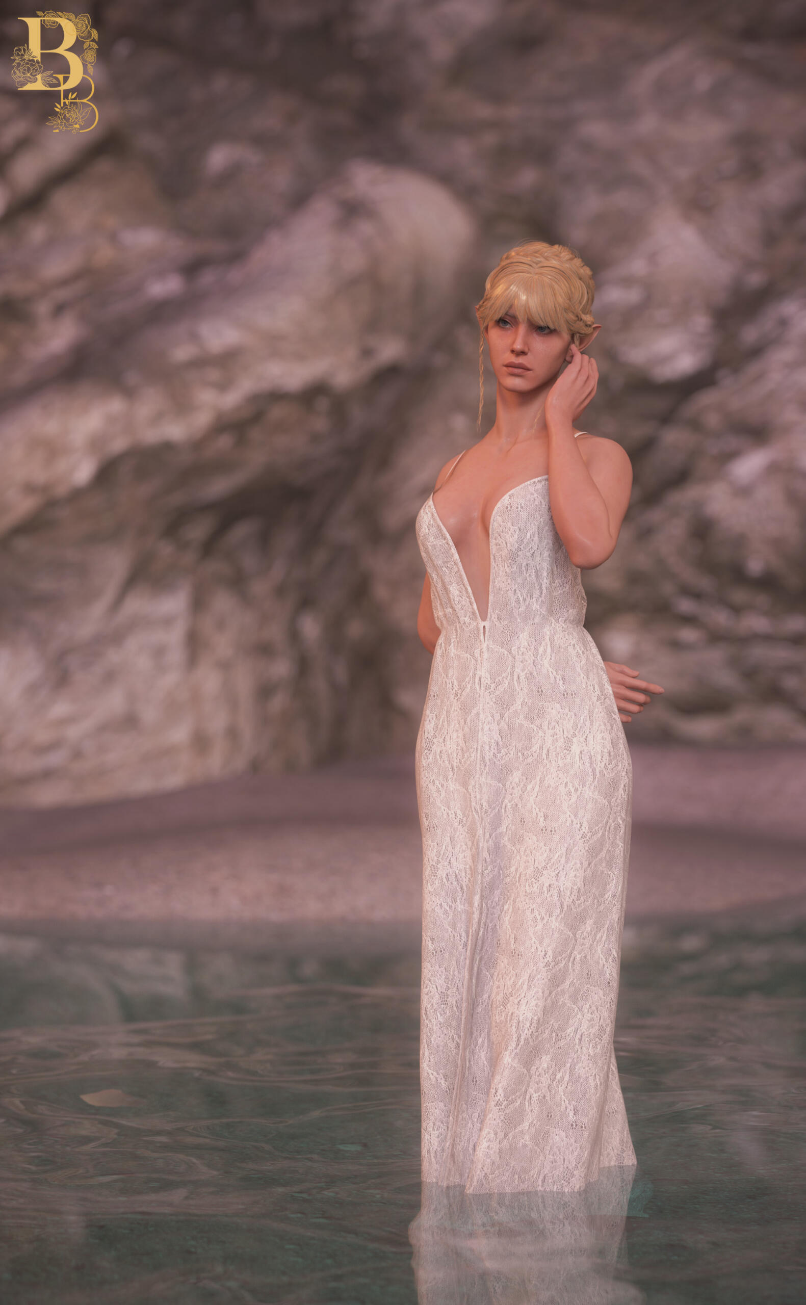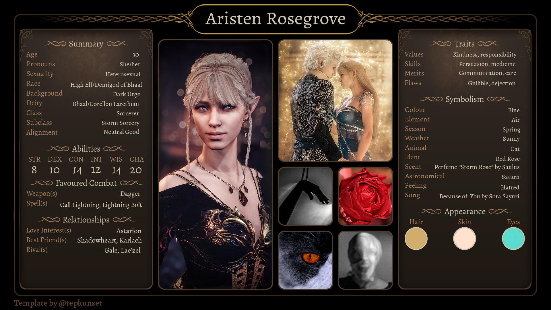 Early years of life:Aristen was born directly from the God of Murder. When father created her, he wanted her not to be an ordinary Bhaalspawn. She was supposed to be an immortal, eternally young demigod. Her appearance was supposed to be the opposite of her destiny. Beautiful and delicate beauty, bright blue-turquoise eyes, light blonde hair. Her look was supposed to attract and inspire trust. Could an elf who looked like an innocent angel be a bloody murderer? And so it happened - Aristen was born, for now as a storm sorcery elven baby. Bhaal wanted her to be very high in the hierarchy when she grew up, but the attack on the temple by unknown perpetrators thwarted these plans. During the raid, an elven infant was found with a white, decorative scarf with the word "Aristen" written in blood on it.The child was placed in the elves’ village in the stepfamily of wood elves called Rosegrove. Only her mother, father and grandmother knew that she might be Bhaal's child and they decided that they will do their best to save Aristen from her destiny. Aristen developed her magical skills and she did not show any murderous symptoms, on the contrary, she showed great empathy and kindness. Ari had a great relationship with her stepfamily and was much-loved in the village. However, everything changed when she was 25. A very handsome and gallant half-elf Elwyn came to their village. Aristen very quickly fell in love with him - she thought it was mutual.