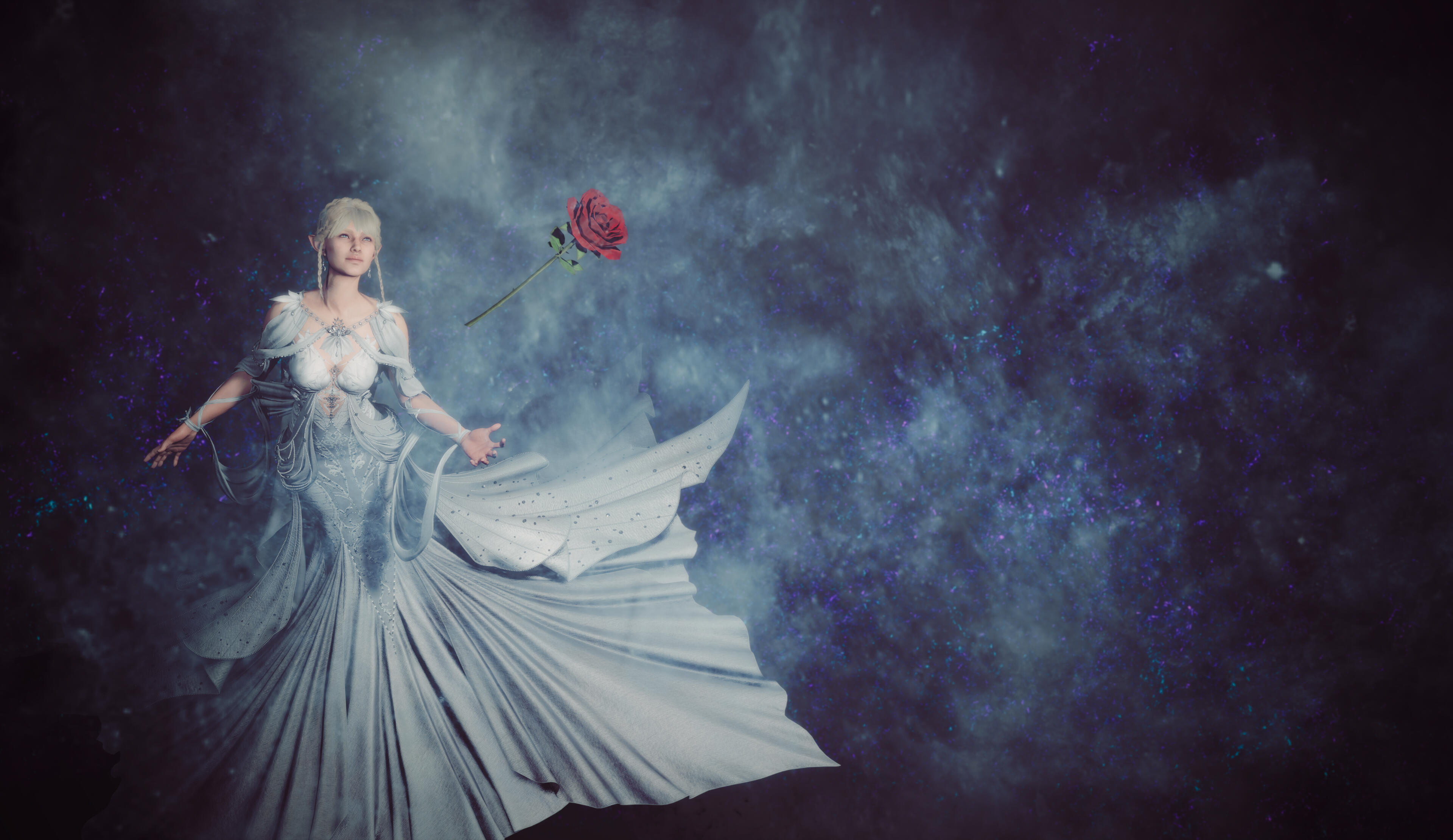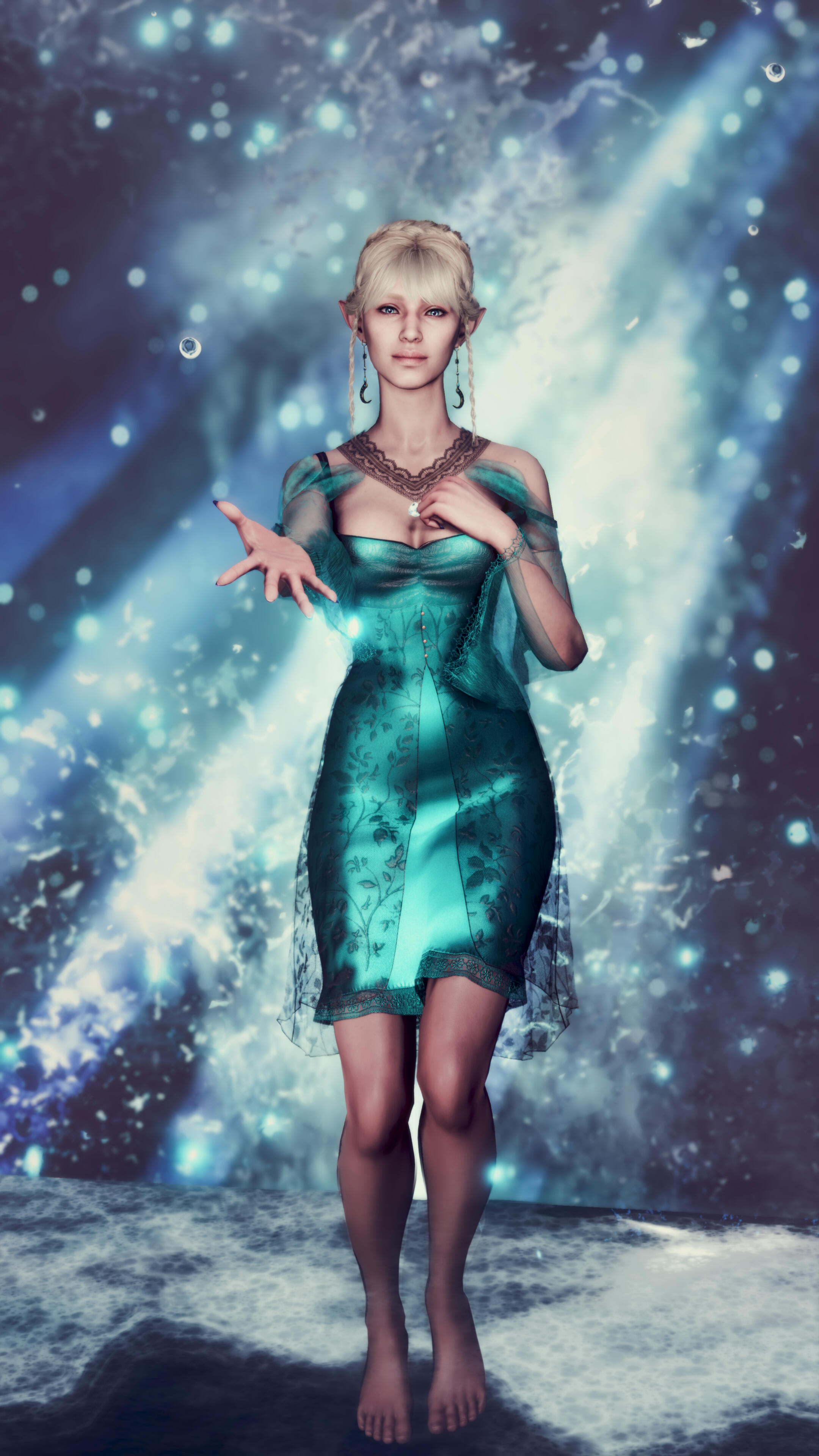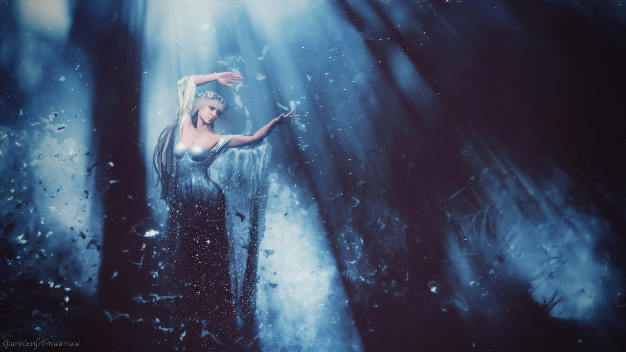 Early years of life:Aristen was born directly from the God of Murder. When father created her, he wanted her not to be an ordinary Bhaalspawn. She was supposed to be an immortal, eternally young demigod. Her appearance was supposed to be the opposite of her destiny. Beautiful and delicate beauty, bright blue-turquoise eyes, light blonde hair. Her look was supposed to attract and inspire trust. Could an elf who looked like an innocent angel be a bloody murderer? And so it happened - Aristen was born, for now as a storm sorcery elven baby. Bhaal wanted her to be very high in the hierarchy when she grew up, but the attack on the temple by unknown perpetrators thwarted these plans. During the raid, an elven infant was found with a white, decorative scarf with the word "Aristen" written in blood on it.The child was placed in the elves’ village in the stepfamily of wood elves called Rosegrove. Only her mother, father and grandmother knew that she might be Bhaal's child and they decided that they will do their best to save Aristen from her destiny. Aristen developed her magical skills and she did not show any murderous symptoms, on the contrary, she showed great empathy and kindness. Ari had a great relationship with her stepfamily and was much-loved in the village. However, everything changed when she was 25. A very handsome and gallant half-elf Elwyn came to their village. Aristen very quickly fell in love with him - she thought it was mutual.