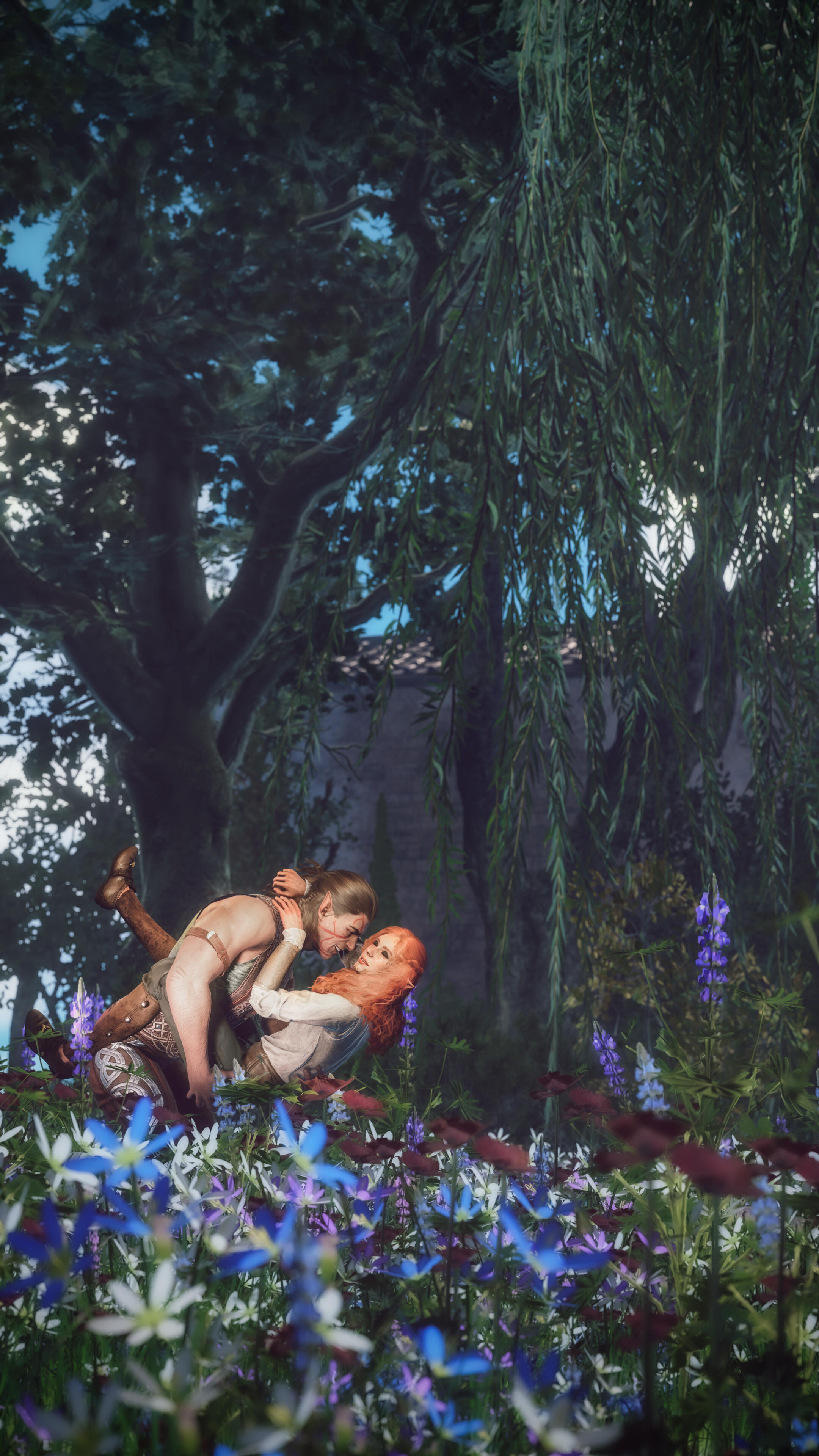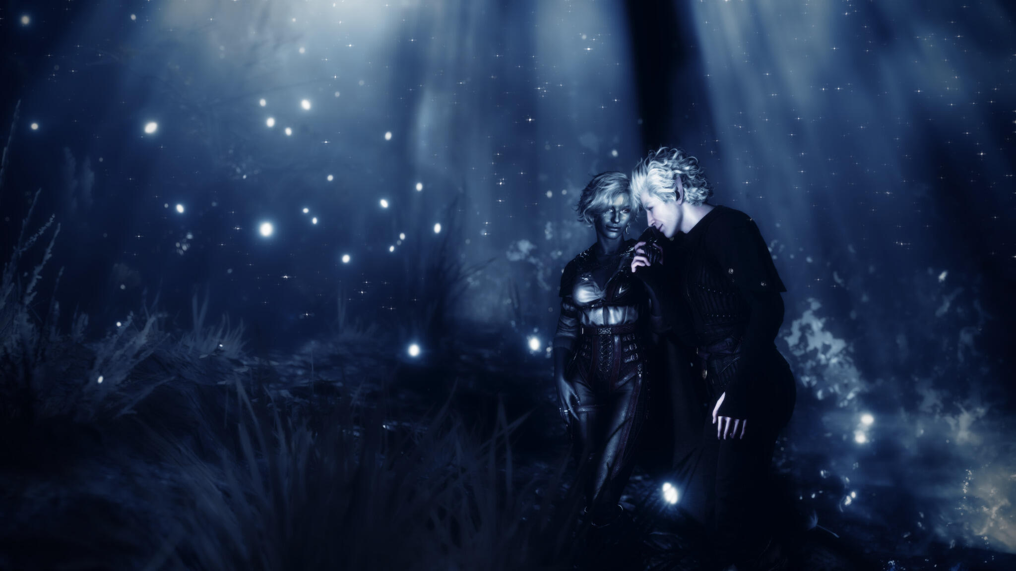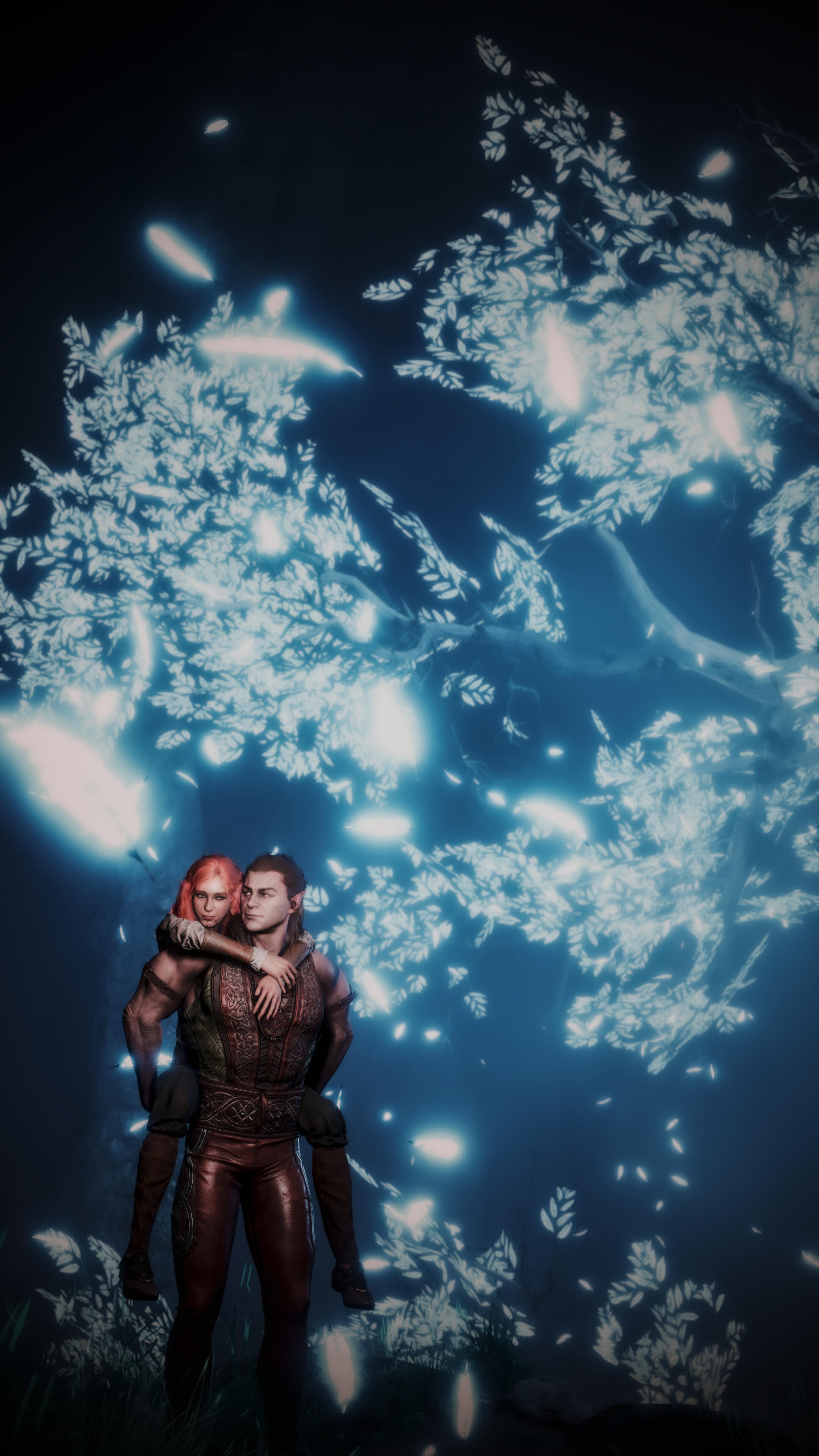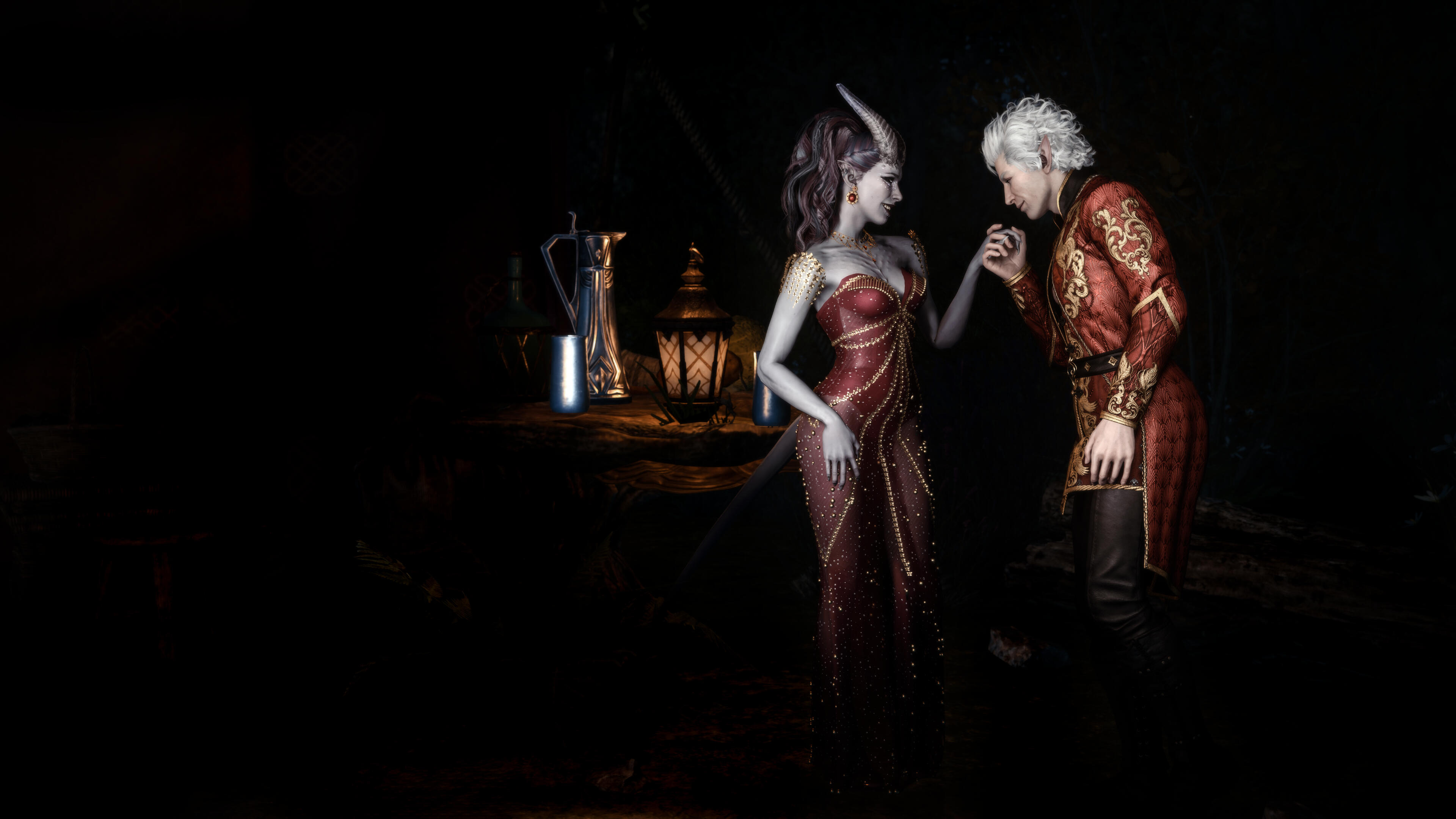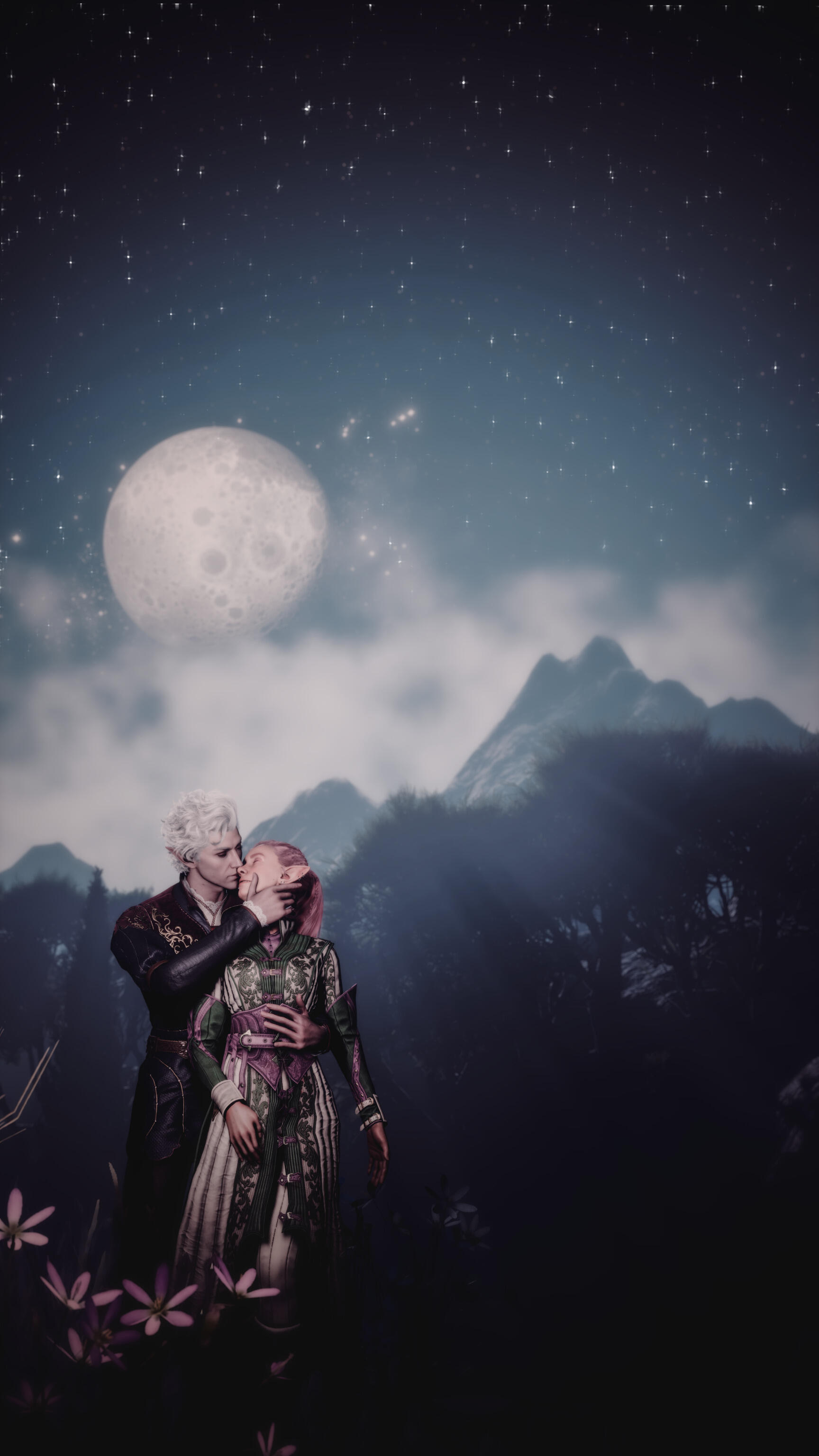 She also remembered the man who contributed to all her tragedy - Elwyn. She remembered how he feigned love for her and he did it all of his own free will for financial gain. She hated this man in few seconds.Aristen and Astarion stayed in the village for a while and moved on to find a way to protect Astarion from the sun. They also had a new companion, Fiona (Aristen's younger sister) who wanted to see some of the world. To have money for the trip, the three of them took various jobs. Sometimes they were mercenaries, sometimes they were doing small jobs or hunting bandits. Fiona also performed in inns, as she was a bard.After a long time and reading dozens of old books and scrolls, Aristen, in an old, forgotten temple in the middle of nowhere, found an enchanted pendant that allowed Astarion to enjoy the sun again after many years. However, all three of them continued their traveling lifestyle.One night Aristen and Astarion were lying on the grass and watching the stars. Then Ari suggested to her beloved one that they maybe return permanently to Baldur's Gate and start a simple, city life. He agreed and asked if she would become his wife. Aristen was surprised, despite spending so many years by Astarion's side, she was afraid that one day he would leave her. She still considered herself a monster, even though she had cut herself off from her father many years ago. Aristen was always afraid that she would somehow become a bloodthirsty murderer again. And Astarion could have almost any woman - she had seen more than once how lustfully ladies looked at him. But he chose her and wants to be with her forever.The wedding took place in her native village. Her entire family and friends celebrated one of the most beautiful days of her life.