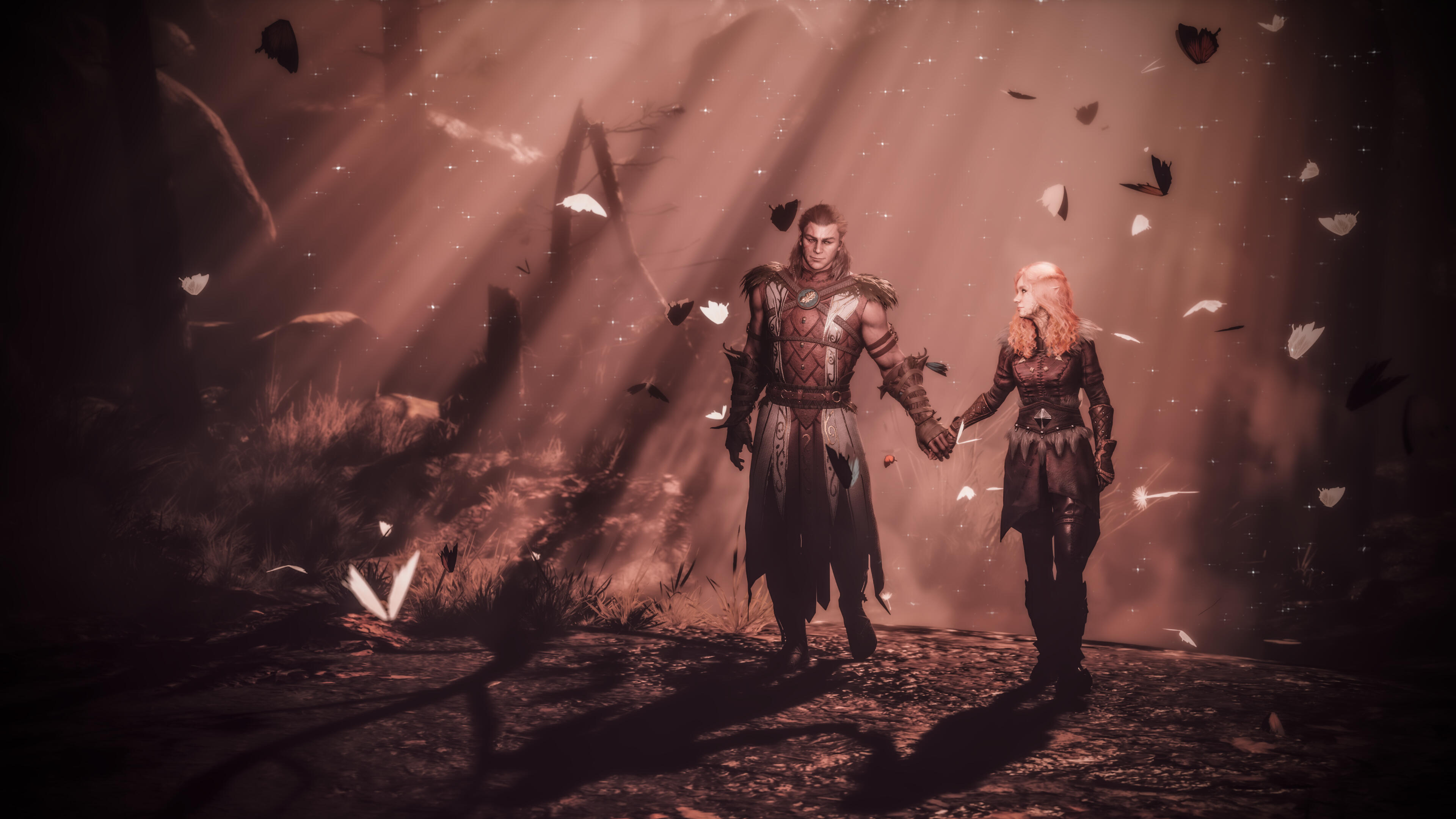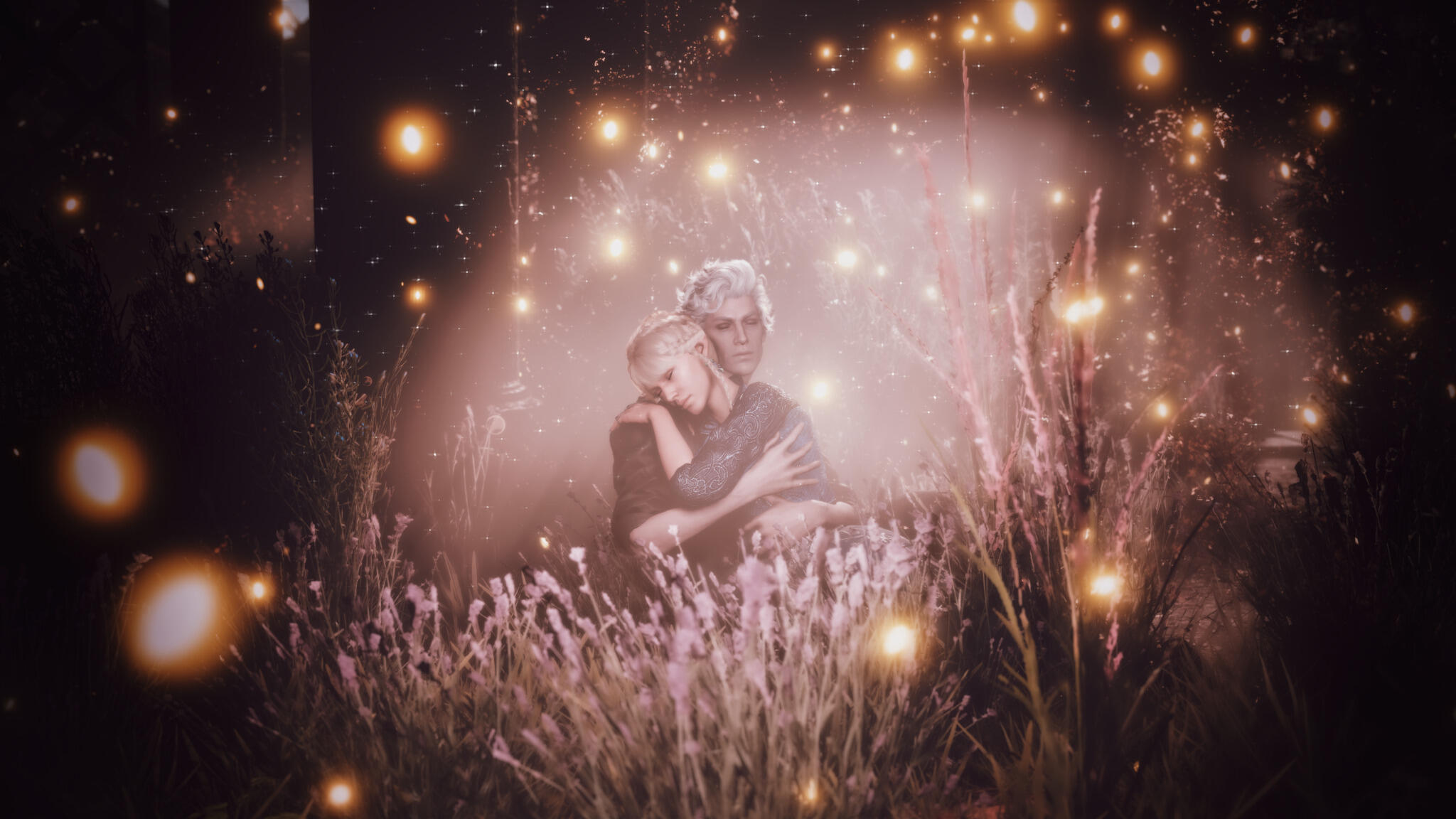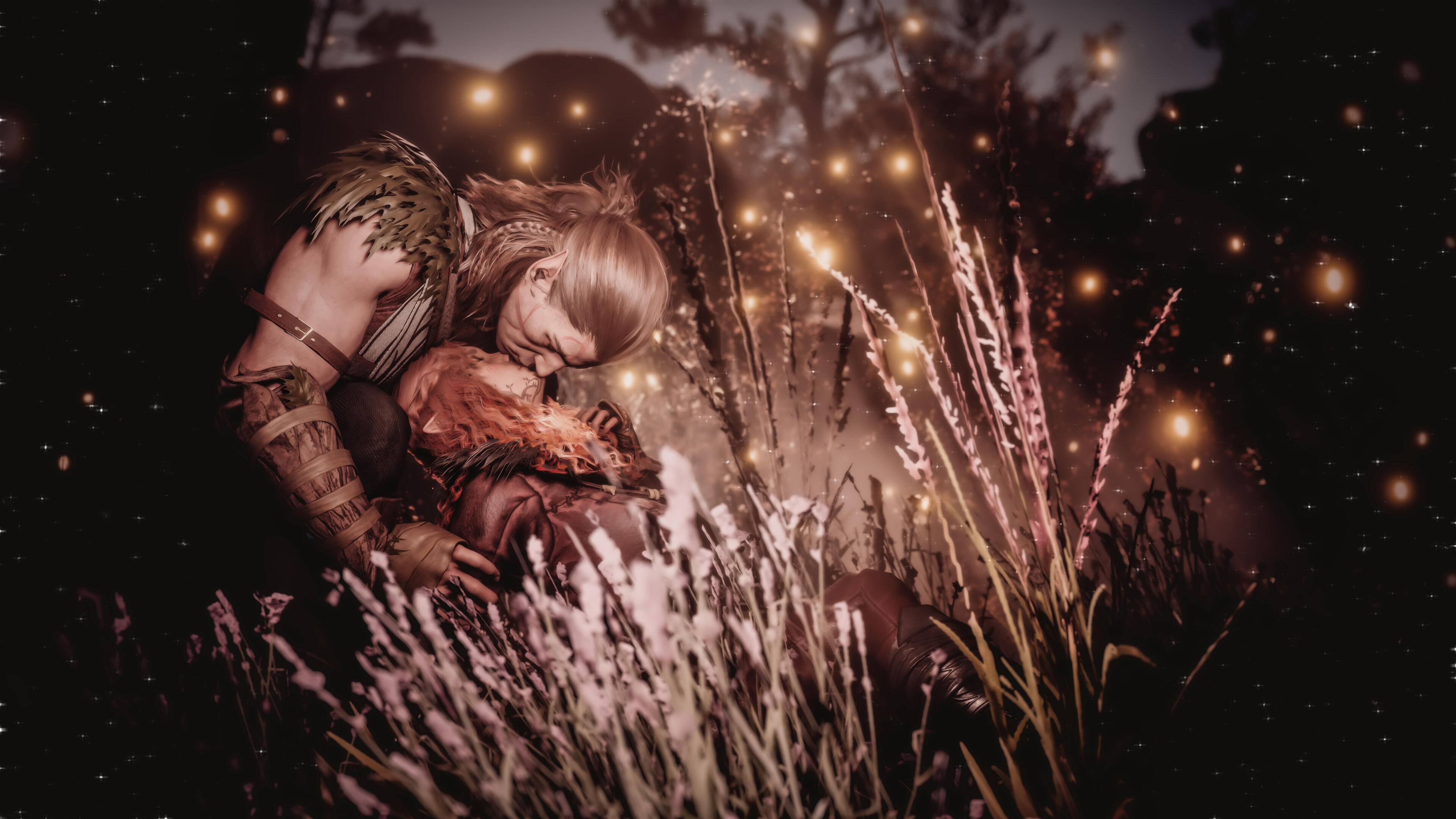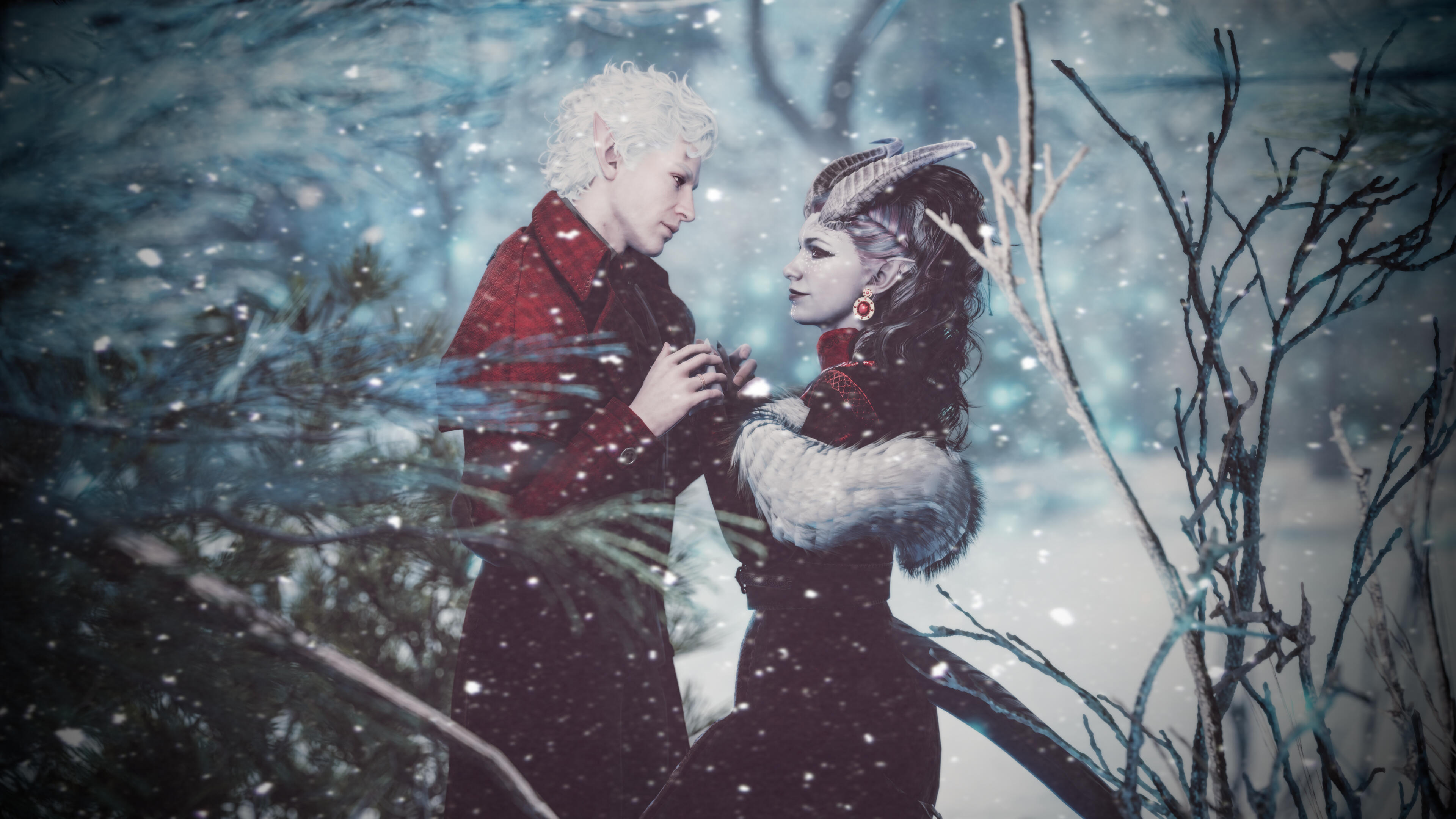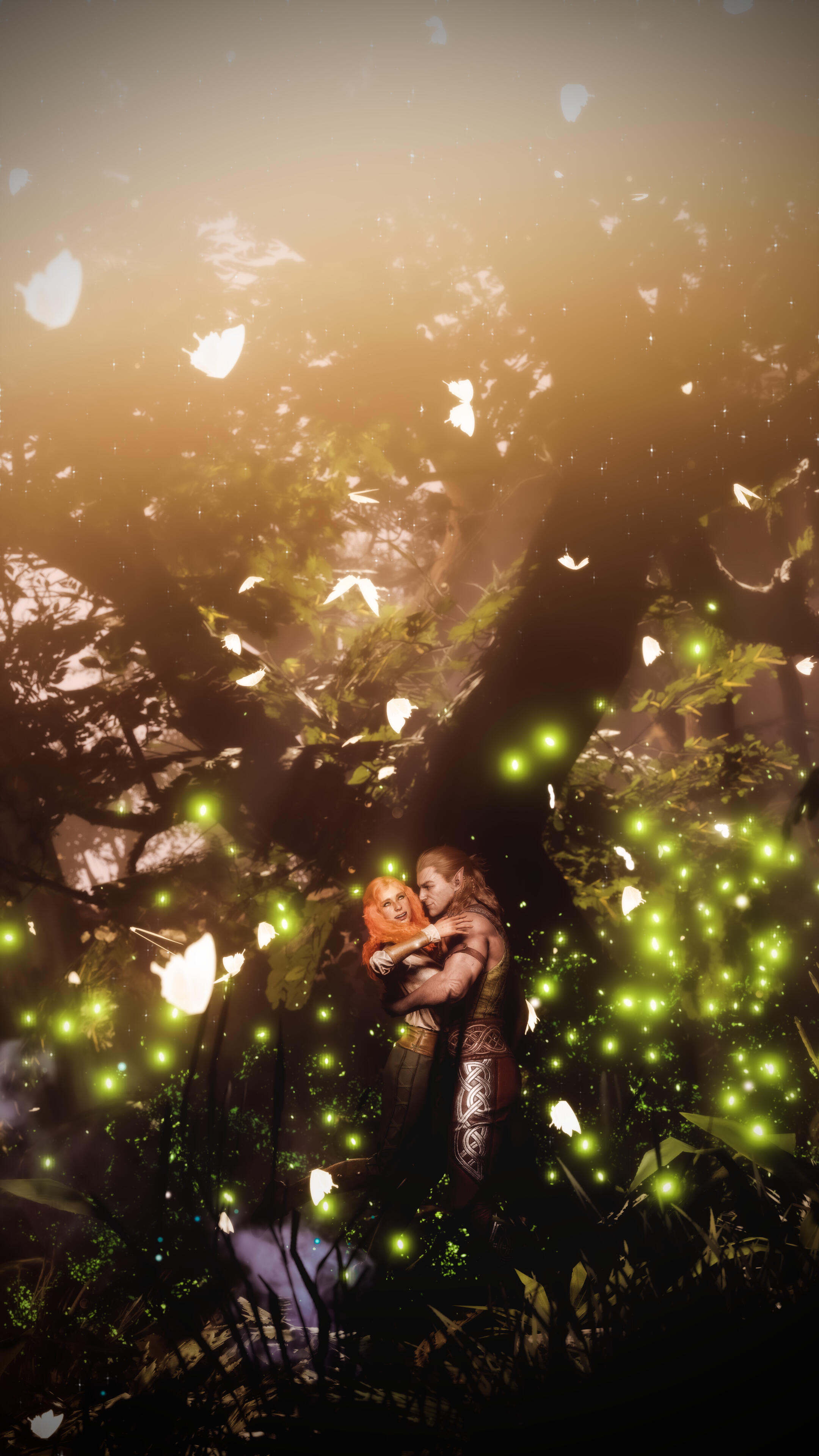 She also remembered the man who contributed to all her tragedy - Elwyn. She remembered how he feigned love for her and he did it all of his own free will for financial gain. She hated this man in few seconds.Aristen and Astarion stayed in the village for a while and moved on to find a way to protect Astarion from the sun. They also had a new companion, Fiona (Aristen's younger sister) who wanted to see some of the world. To have money for the trip, the three of them took various jobs. Sometimes they were mercenaries, sometimes they were doing small jobs or hunting bandits. Fiona also performed in inns, as she was a bard.After a long time and reading dozens of old books and scrolls, Aristen, in an old, forgotten temple in the middle of nowhere, found an enchanted pendant that allowed Astarion to enjoy the sun again after many years. However, all three of them continued their traveling lifestyle.One night Aristen and Astarion were lying on the grass and watching the stars. Then Ari suggested to her beloved one that they maybe return permanently to Baldur's Gate and start a simple, city life. He agreed and asked if she would become his wife. Aristen was surprised, despite spending so many years by Astarion's side, she was afraid that one day he would leave her. She still considered herself a monster, even though she had cut herself off from her father many years ago. Aristen was always afraid that she would somehow become a bloodthirsty murderer again. And Astarion could have almost any woman - she had seen more than once how lustfully ladies looked at him. But he chose her and wants to be with her forever.The wedding took place in her native village. Her entire family and friends celebrated one of the most beautiful days of her life.