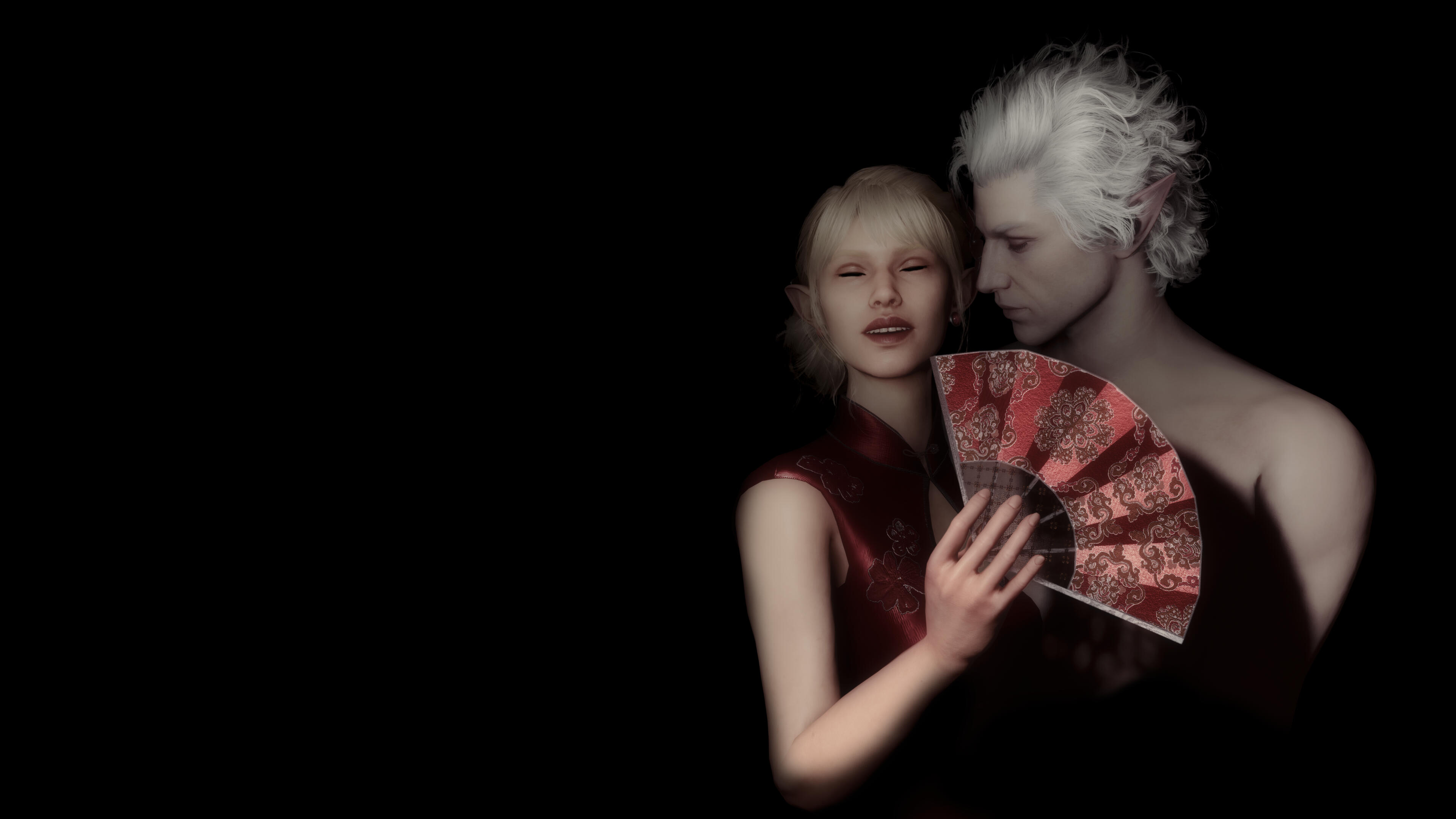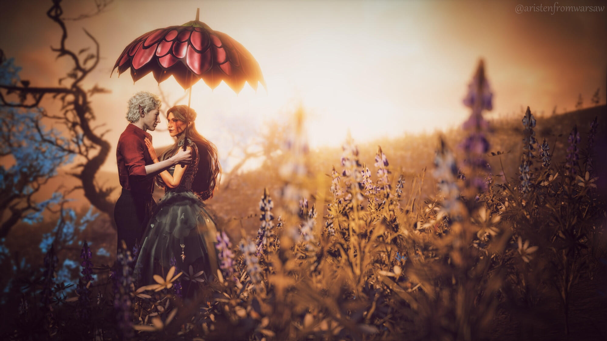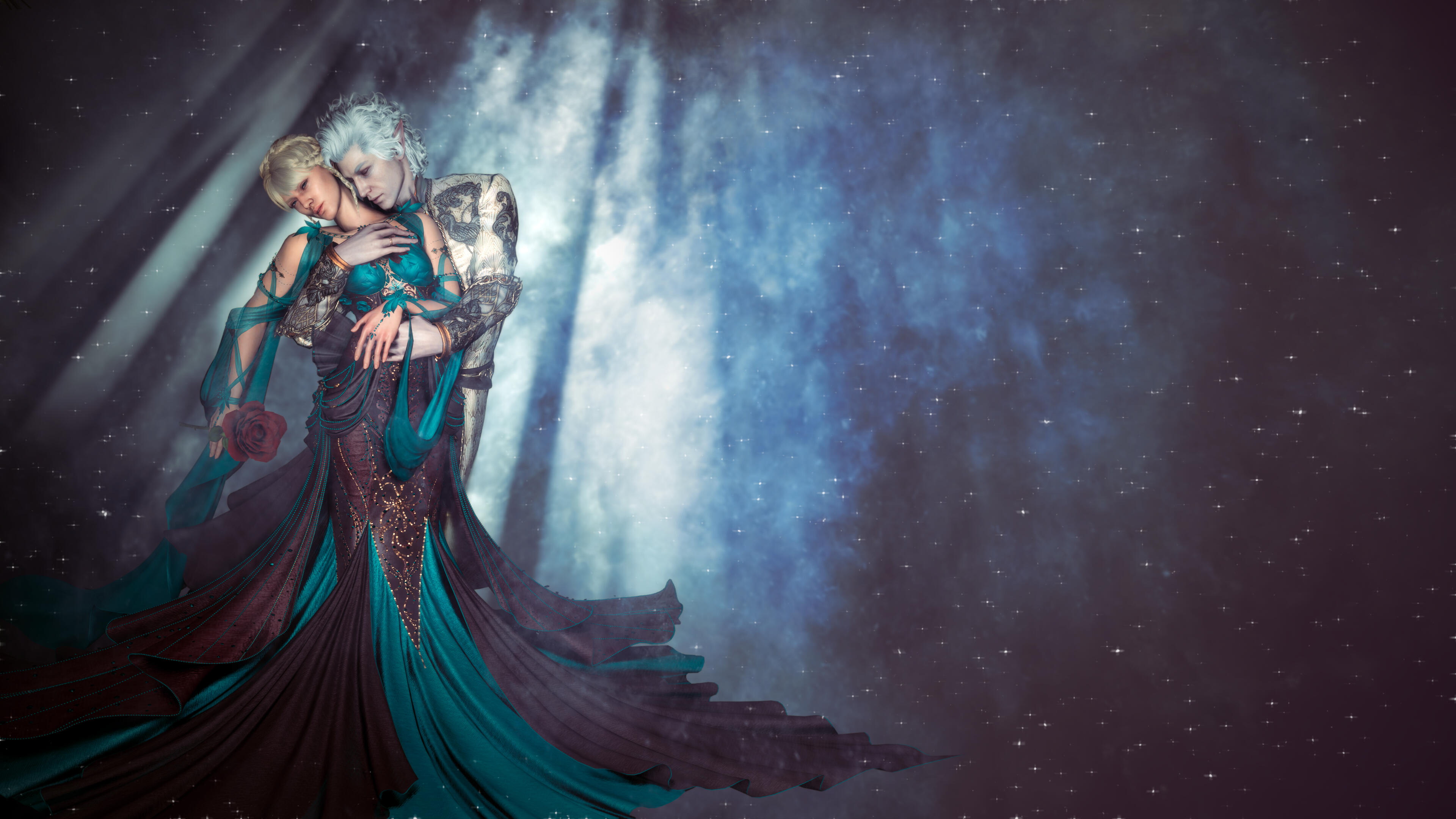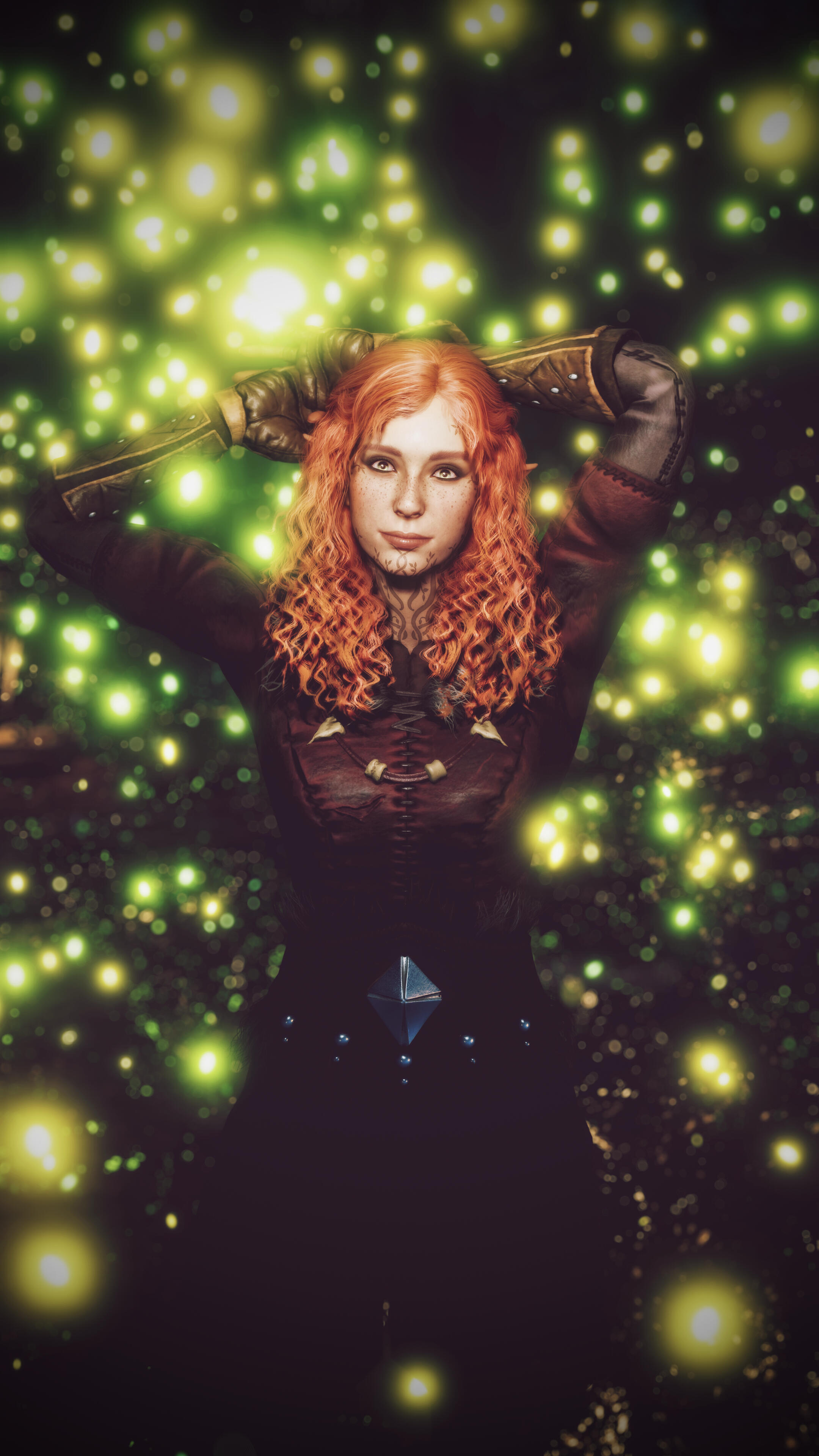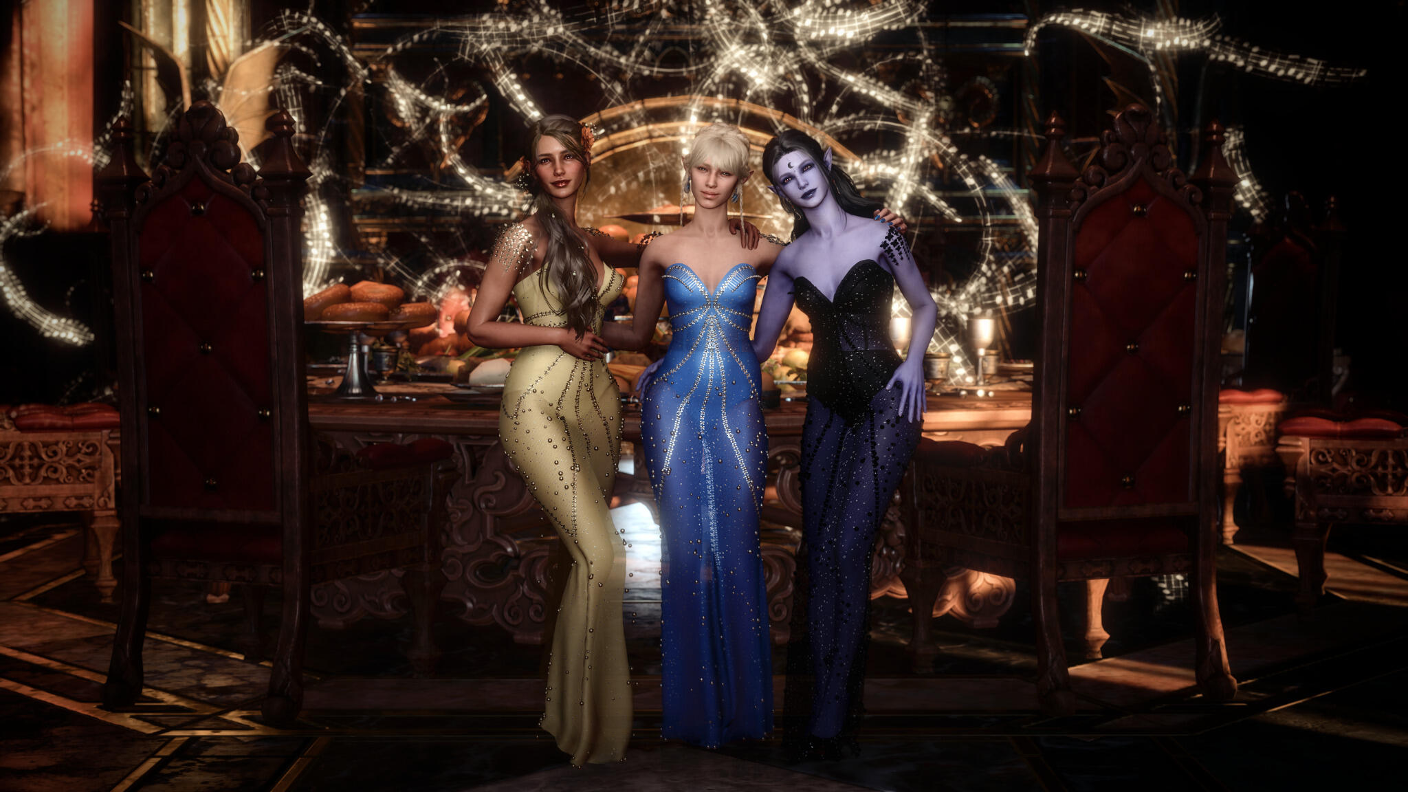 She also remembered the man who contributed to all her tragedy - Elwyn. She remembered how he feigned love for her and he did it all of his own free will for financial gain. She hated this man in few seconds.Aristen and Astarion stayed in the village for a while and moved on to find a way to protect Astarion from the sun. They also had a new companion, Fiona (Aristen's younger sister) who wanted to see some of the world. To have money for the trip, the three of them took various jobs. Sometimes they were mercenaries, sometimes they were doing small jobs or hunting bandits. Fiona also performed in inns, as she was a bard.After a long time and reading dozens of old books and scrolls, Aristen, in an old, forgotten temple in the middle of nowhere, found an enchanted pendant that allowed Astarion to enjoy the sun again after many years. However, all three of them continued their traveling lifestyle.One night Aristen and Astarion were lying on the grass and watching the stars. Then Ari suggested to her beloved one that they maybe return permanently to Baldur's Gate and start a simple, city life. He agreed and asked if she would become his wife. Aristen was surprised, despite spending so many years by Astarion's side, she was afraid that one day he would leave her. She still considered herself a monster, even though she had cut herself off from her father many years ago. Aristen was always afraid that she would somehow become a bloodthirsty murderer again. And Astarion could have almost any woman - she had seen more than once how lustfully ladies looked at him. But he chose her and wants to be with her forever.The wedding took place in her native village. Her entire family and friends celebrated one of the most beautiful days of her life.