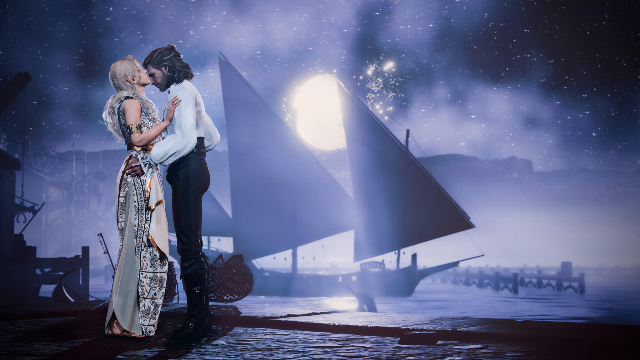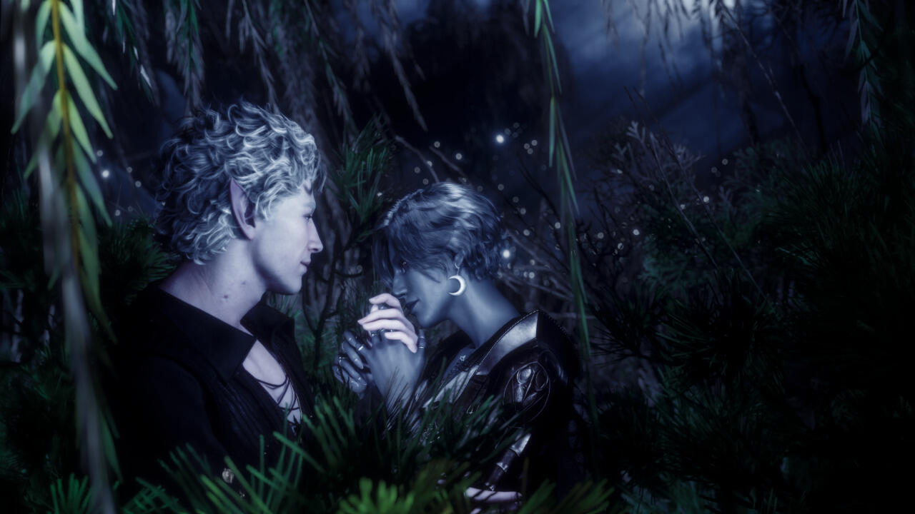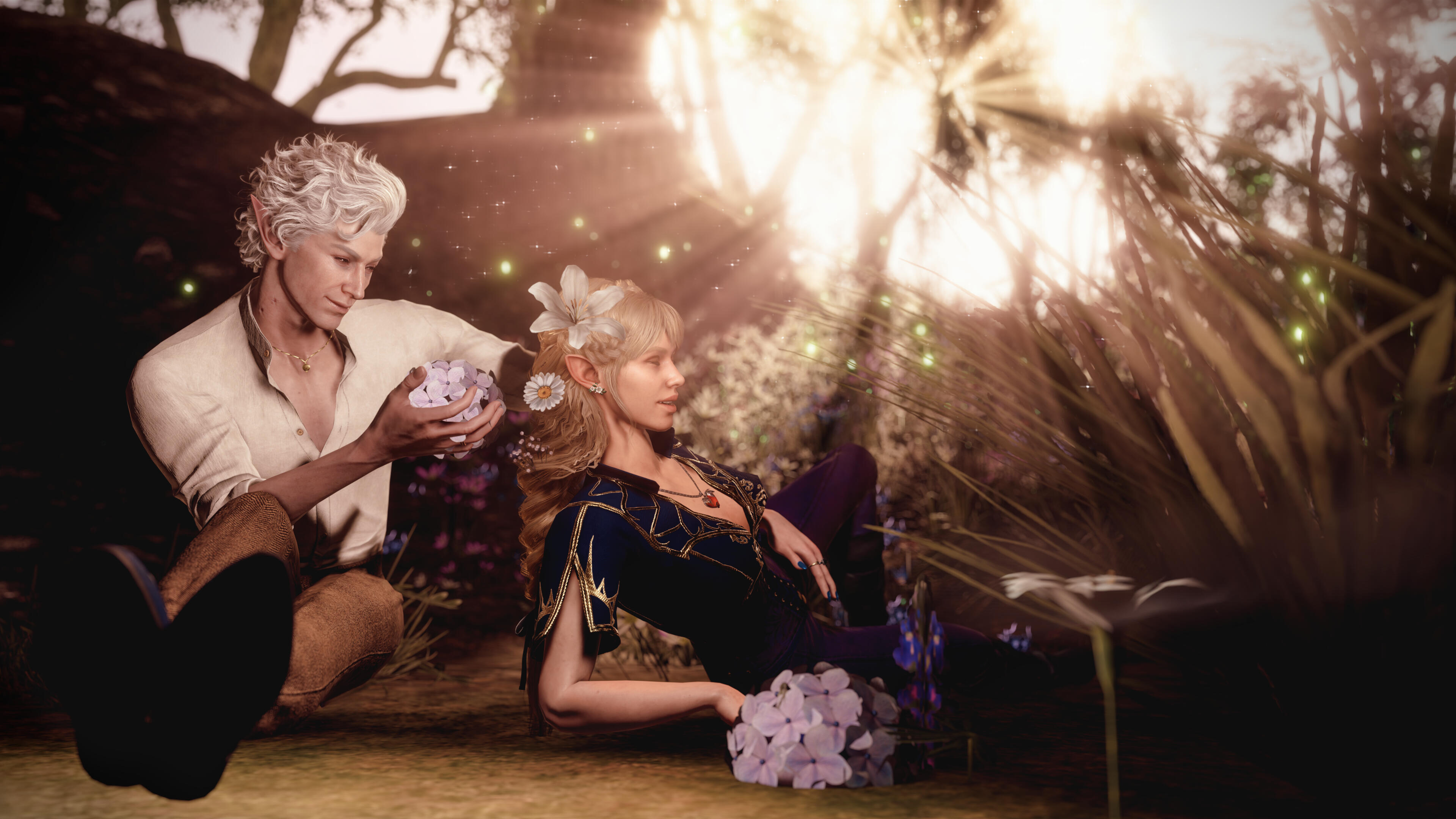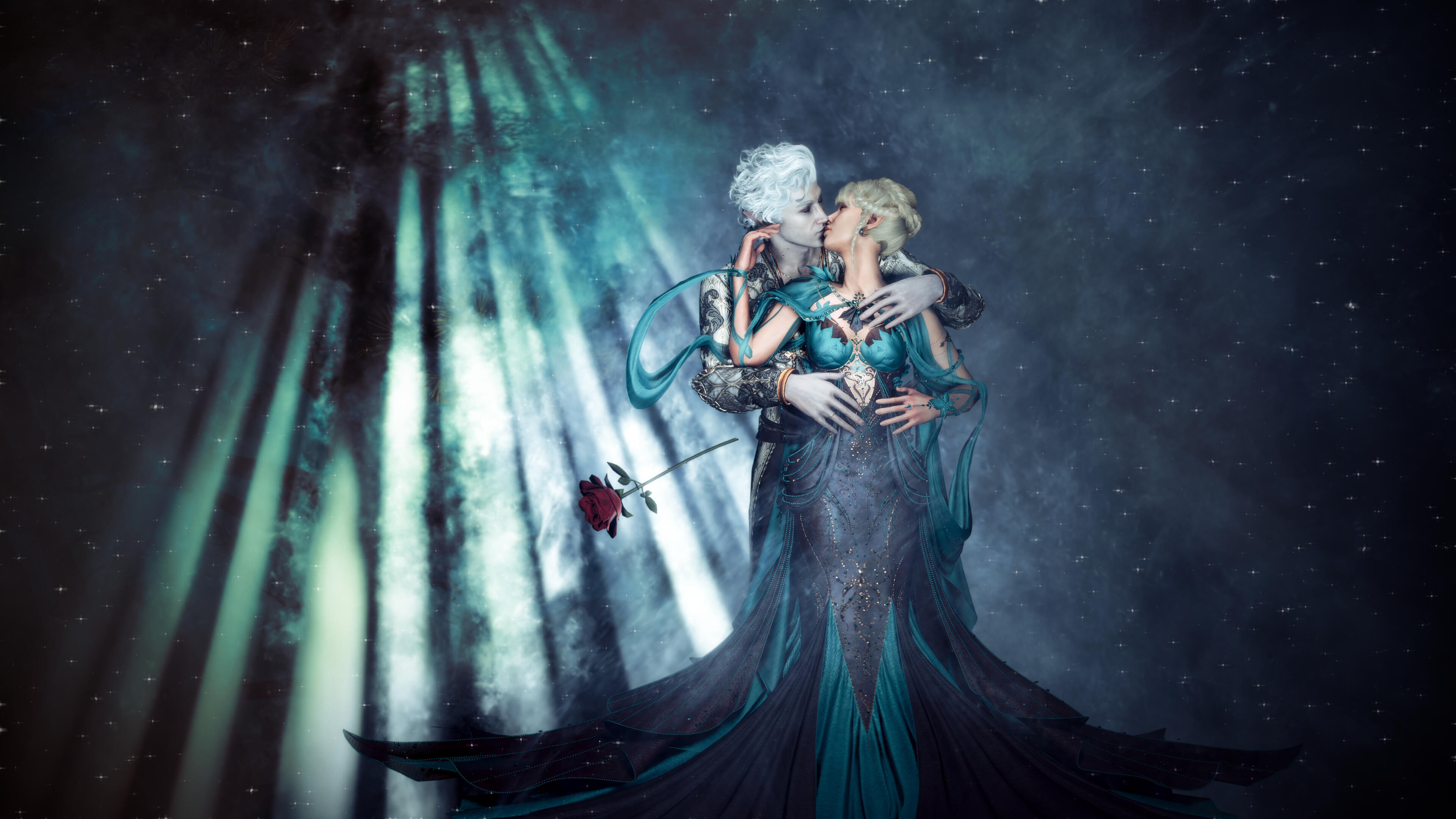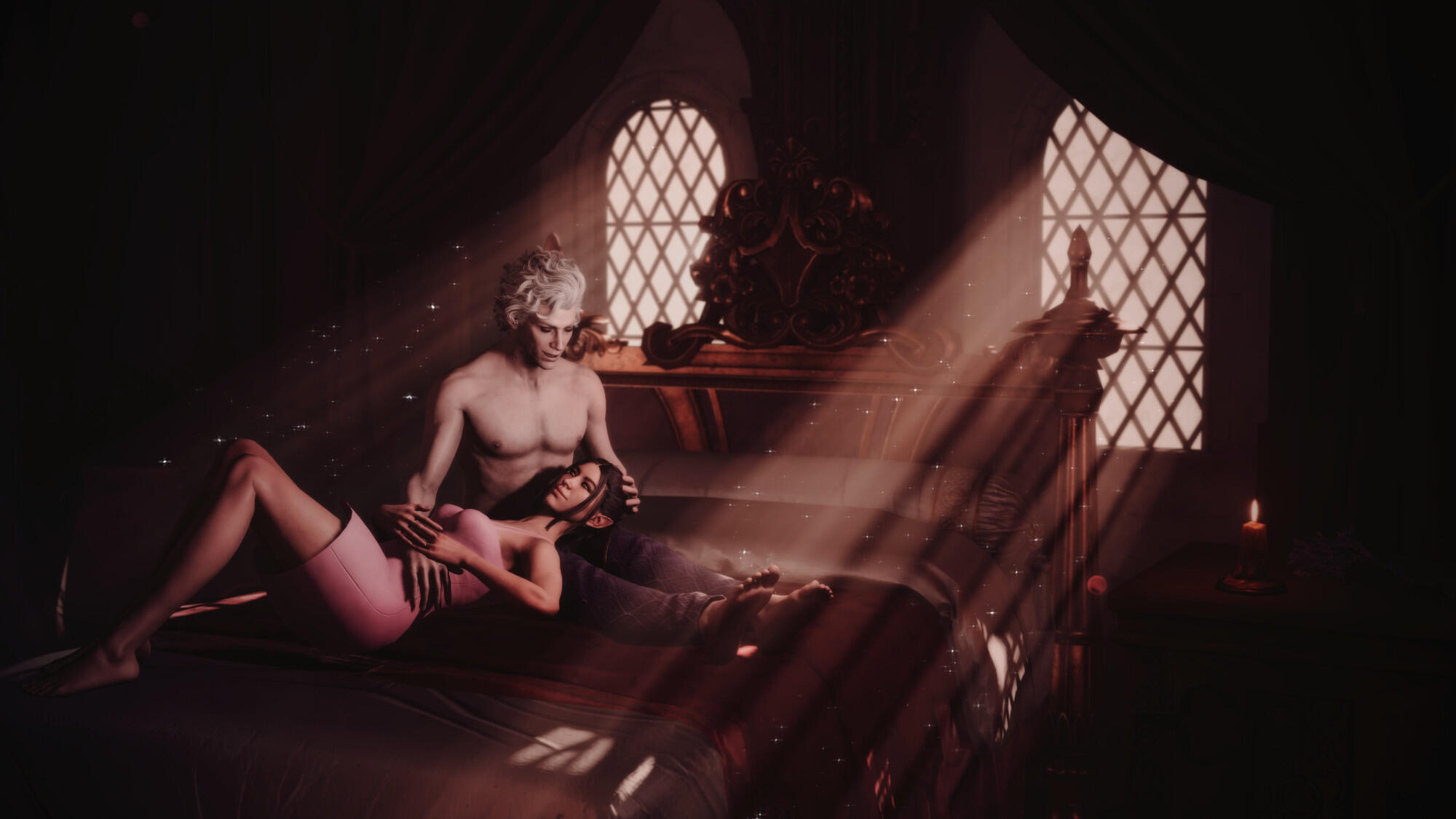 She also remembered the man who contributed to all her tragedy - Elwyn. She remembered how he feigned love for her and he did it all of his own free will for financial gain. She hated this man in few seconds.Aristen and Astarion stayed in the village for a while and moved on to find a way to protect Astarion from the sun. They also had a new companion, Fiona (Aristen's younger sister) who wanted to see some of the world. To have money for the trip, the three of them took various jobs. Sometimes they were mercenaries, sometimes they were doing small jobs or hunting bandits. Fiona also performed in inns, as she was a bard.After a long time and reading dozens of old books and scrolls, Aristen, in an old, forgotten temple in the middle of nowhere, found an enchanted pendant that allowed Astarion to enjoy the sun again after many years. However, all three of them continued their traveling lifestyle.One night Aristen and Astarion were lying on the grass and watching the stars. Then Ari suggested to her beloved one that they maybe return permanently to Baldur's Gate and start a simple, city life. He agreed and asked if she would become his wife. Aristen was surprised, despite spending so many years by Astarion's side, she was afraid that one day he would leave her. She still considered herself a monster, even though she had cut herself off from her father many years ago. Aristen was always afraid that she would somehow become a bloodthirsty murderer again. And Astarion could have almost any woman - she had seen more than once how lustfully ladies looked at him. But he chose her and wants to be with her forever.The wedding took place in her native village. Her entire family and friends celebrated one of the most beautiful days of her life.