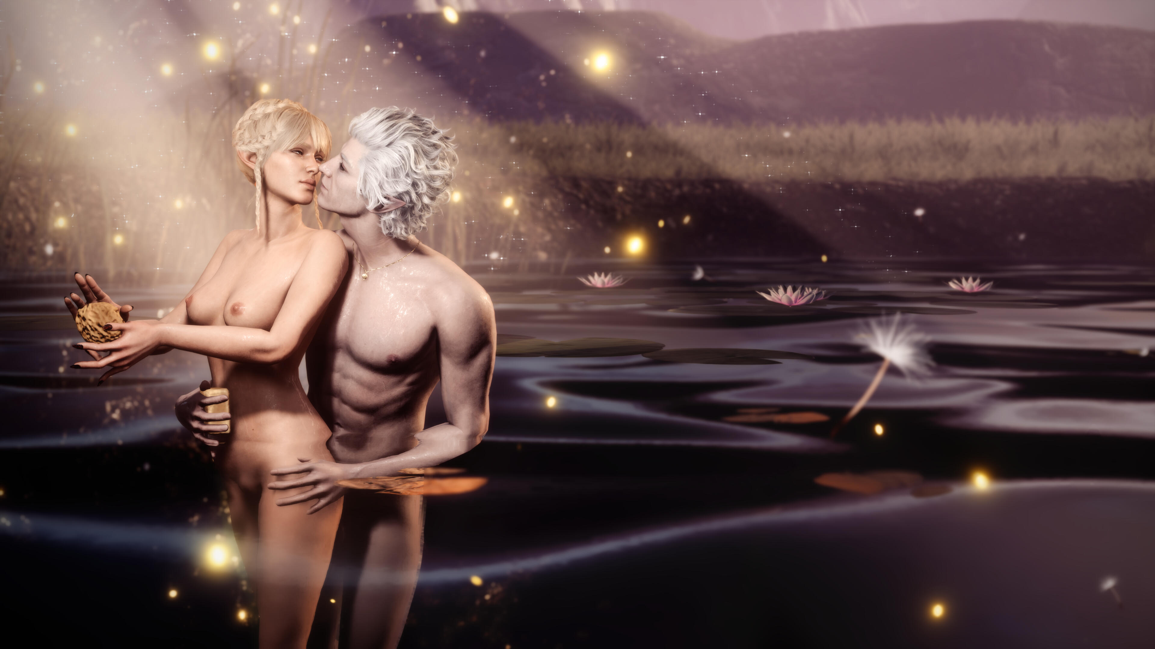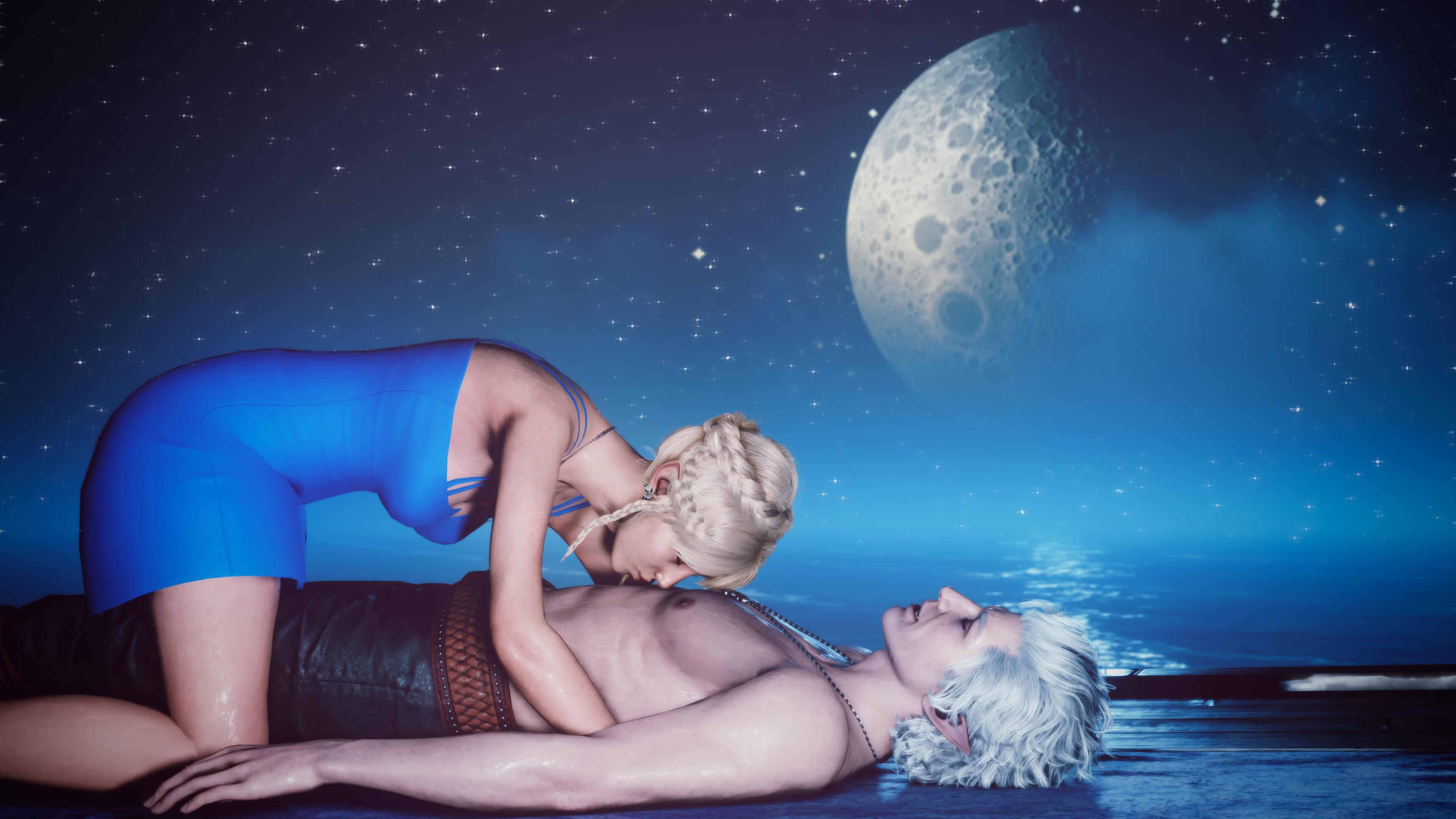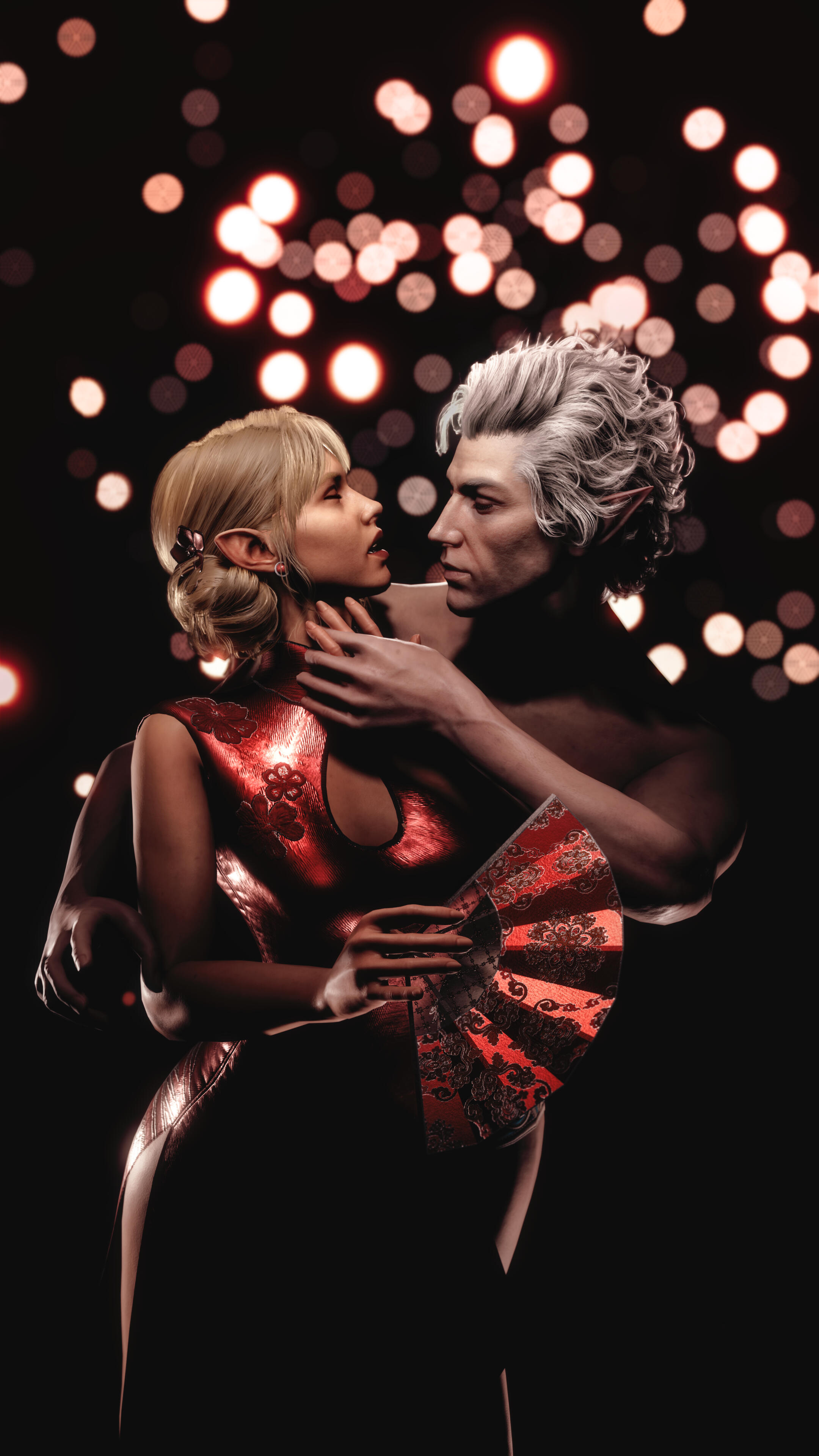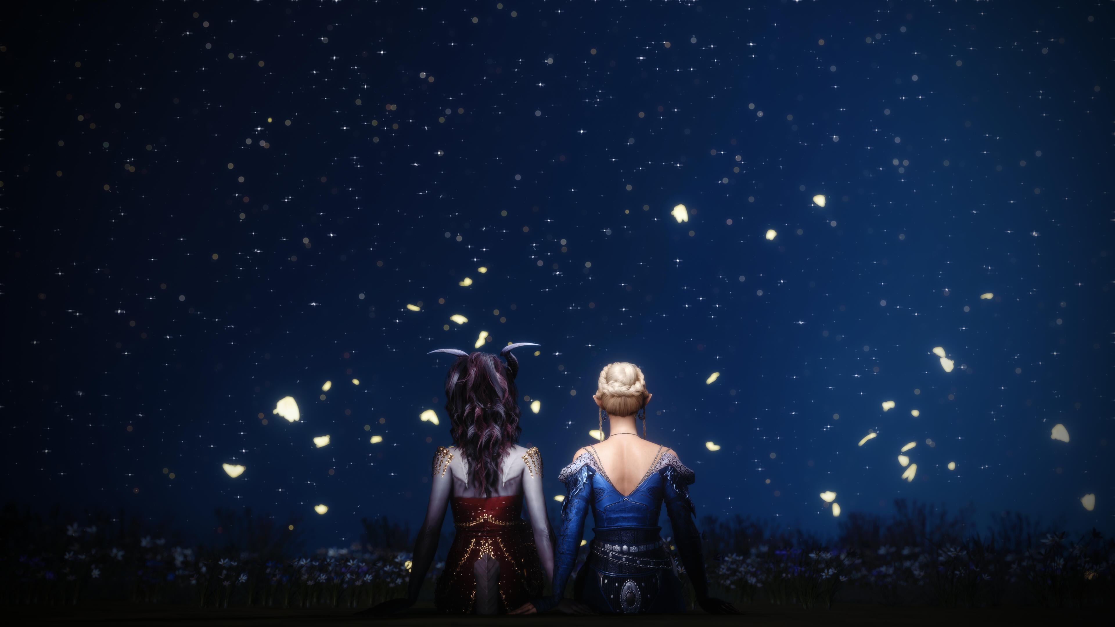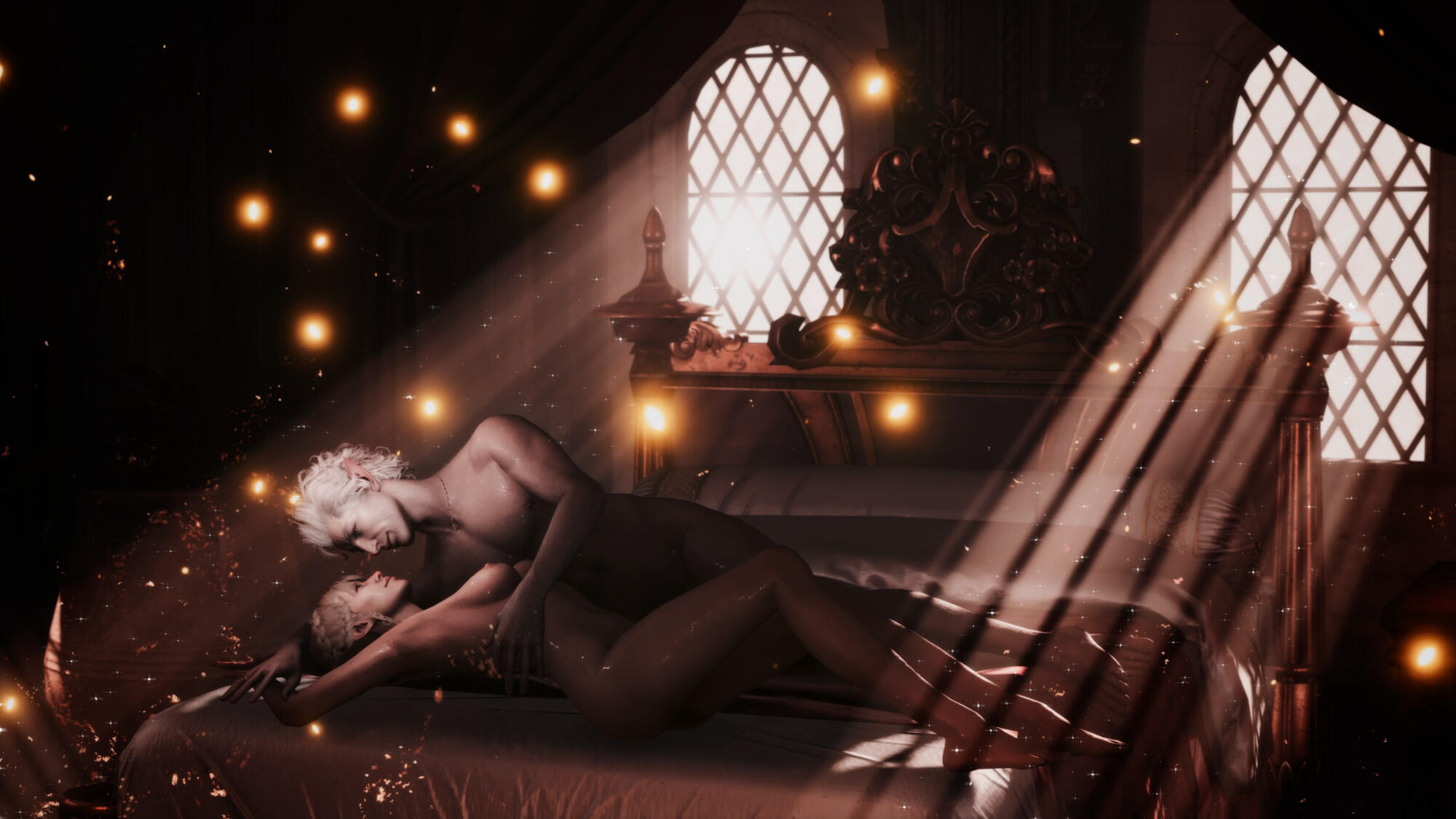 She also remembered the man who contributed to all her tragedy - Elwyn. She remembered how he feigned love for her and he did it all of his own free will for financial gain. She hated this man in few seconds.Aristen and Astarion stayed in the village for a while and moved on to find a way to protect Astarion from the sun. They also had a new companion, Fiona (Aristen's younger sister) who wanted to see some of the world. To have money for the trip, the three of them took various jobs. Sometimes they were mercenaries, sometimes they were doing small jobs or hunting bandits. Fiona also performed in inns, as she was a bard.After a long time and reading dozens of old books and scrolls, Aristen, in an old, forgotten temple in the middle of nowhere, found an enchanted pendant that allowed Astarion to enjoy the sun again after many years. However, all three of them continued their traveling lifestyle.One night Aristen and Astarion were lying on the grass and watching the stars. Then Ari suggested to her beloved one that they maybe return permanently to Baldur's Gate and start a simple, city life. He agreed and asked if she would become his wife. Aristen was surprised, despite spending so many years by Astarion's side, she was afraid that one day he would leave her. She still considered herself a monster, even though she had cut herself off from her father many years ago. Aristen was always afraid that she would somehow become a bloodthirsty murderer again. And Astarion could have almost any woman - she had seen more than once how lustfully ladies looked at him. But he chose her and wants to be with her forever.The wedding took place in her native village. Her entire family and friends celebrated one of the most beautiful days of her life.