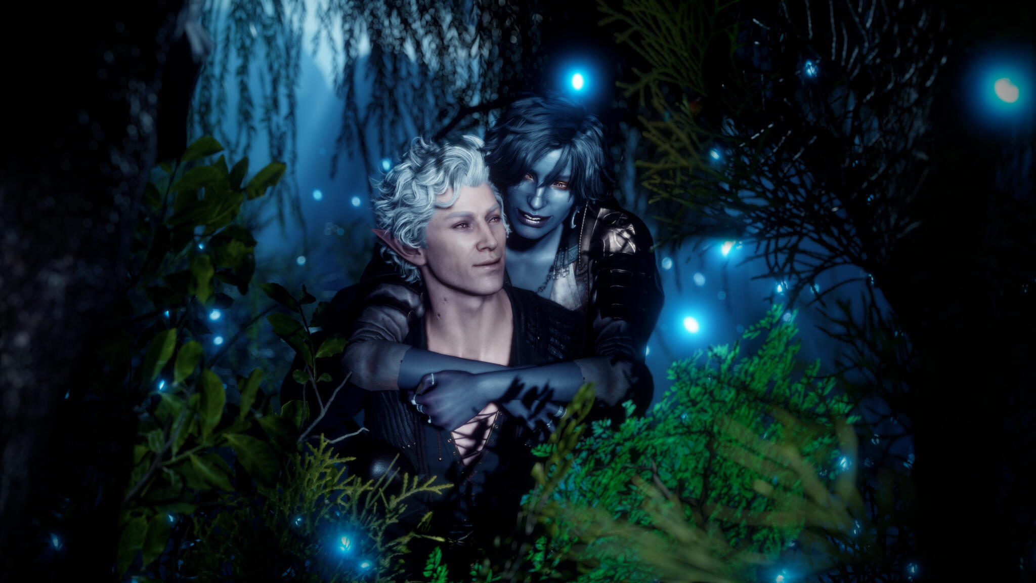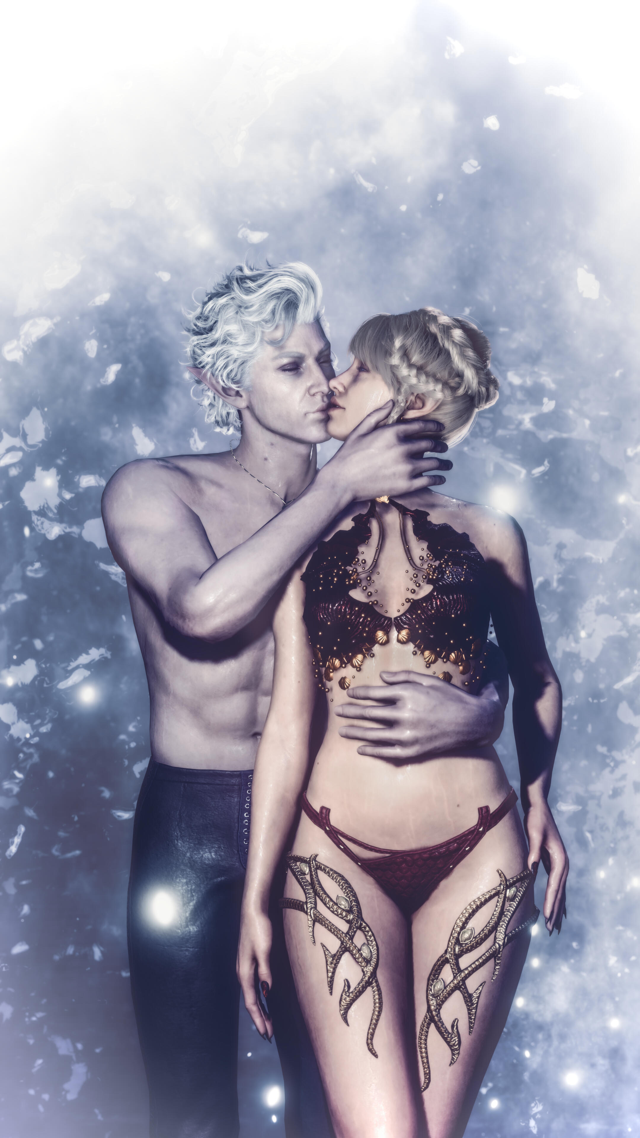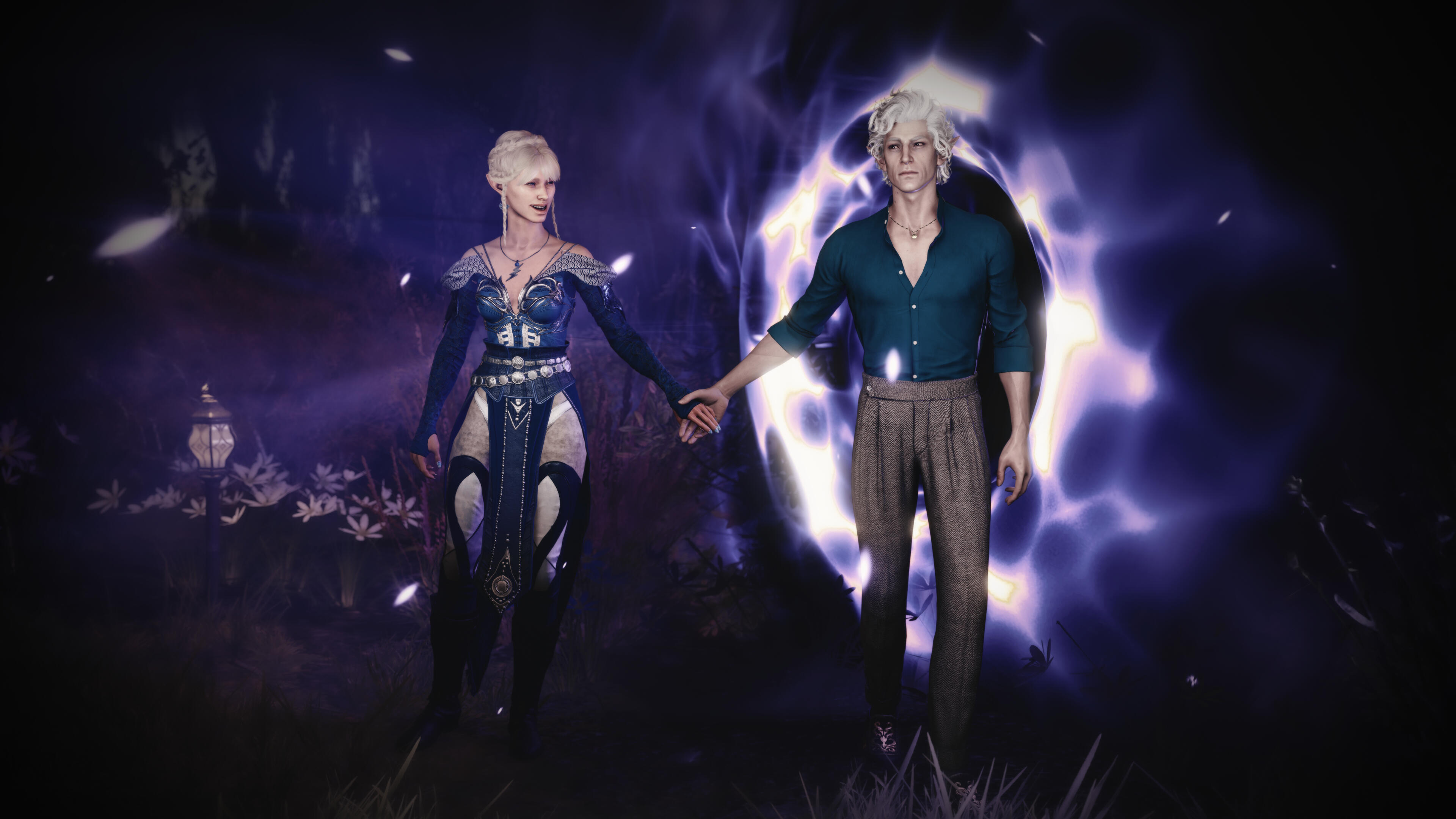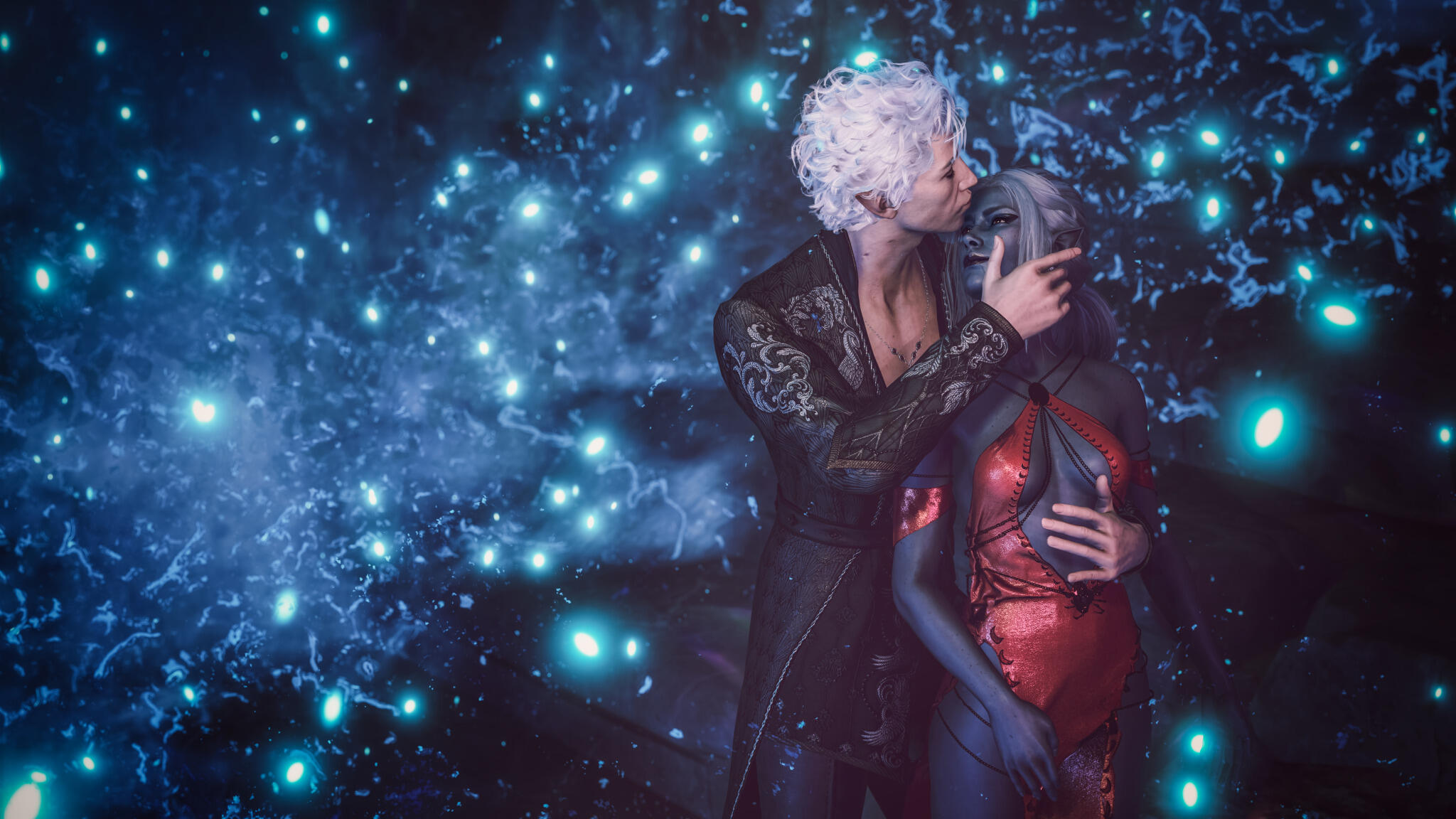 A new beginning (in-game events):Being a Bhaal's doll could have lasted for ages if not a certain incident. One day Aristen was kidnapped by a Mind Flayer's ship. She was infected with their tadpole and lost her memory. Luckily for her, there was a plane crash, which she miraculously survived and managed to escape. Now she had a new goal - to get rid of the tadpole and find out who she is. During her journey she learned the truth about her murderous origins. But she wasn't alone in this. Aristen met some loyal friends: Gale (a human wizard who was harmed by the goddess of magic, Mystra), Karlach (tiefling who, like Ari, was betrayed by the person she trusted), Lae'zel (githyanki who was deceived by her queen), Shadowheart (a priestess of Shar who rejected her goddess), Wyll (human Warlock who sacrificed a lot to save others), Halsin (an elf druid who likes to carve ducks from wood), Jaheira (half elf and High Harper) and Minsc (Jaheira's friend who considers his hamster to be his mentor). And even though everyone supported her, Aristen felt that they didn't fully understand her, they don't know what it means to be someone's puppet. Except for one person who had similar sins as her. A men who has been a plaything for the powerful vampire for over 200 years. That toy was Astarion, high elf, vampire spawn. At first, Aristen had mixed feelings towards him, but later she realized that they were two of a kind. He was the only one who truly understood her dark urge and he truly was not afraid of her. They fell in love with each other.One night the urge to kill become strong and Aristen had mighty desire to kill Astarion. Resisting her whisperings, she decided to do everything to save him. Aristen woke him up and asked him to tie her up. She felt that after such an incident the vampire would break up with her. Who would want a partner who could kill you in the middle of the night ? But no, Astarion didn't break up with her, he was with her all night, watching over her. He wasn't even mad at her. He didn't see her as a monster, but only as a normal person who had been wronged by fate - she saw him the same way. Thanks to Astarion, everything became easier and impossible things became possible.