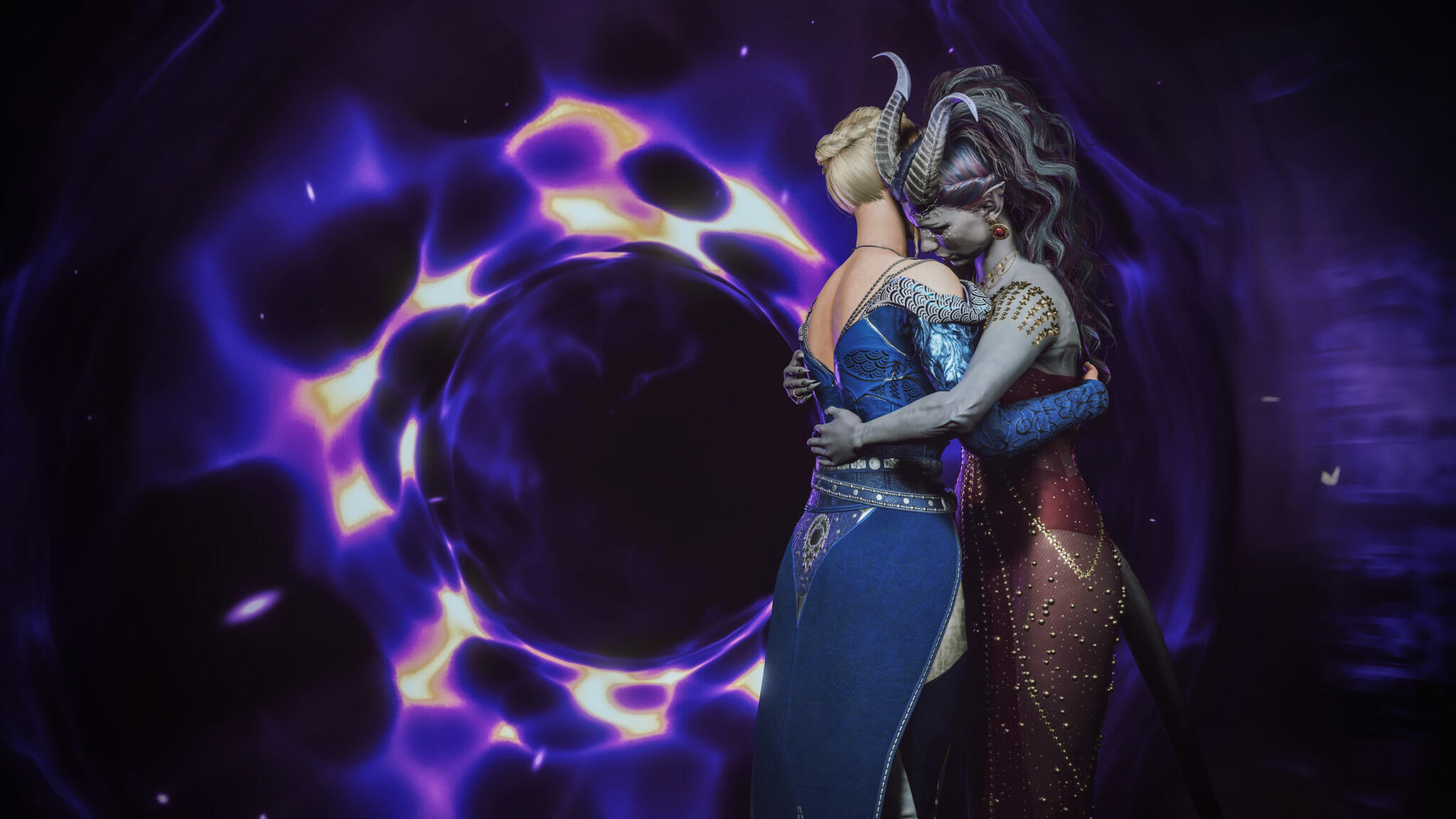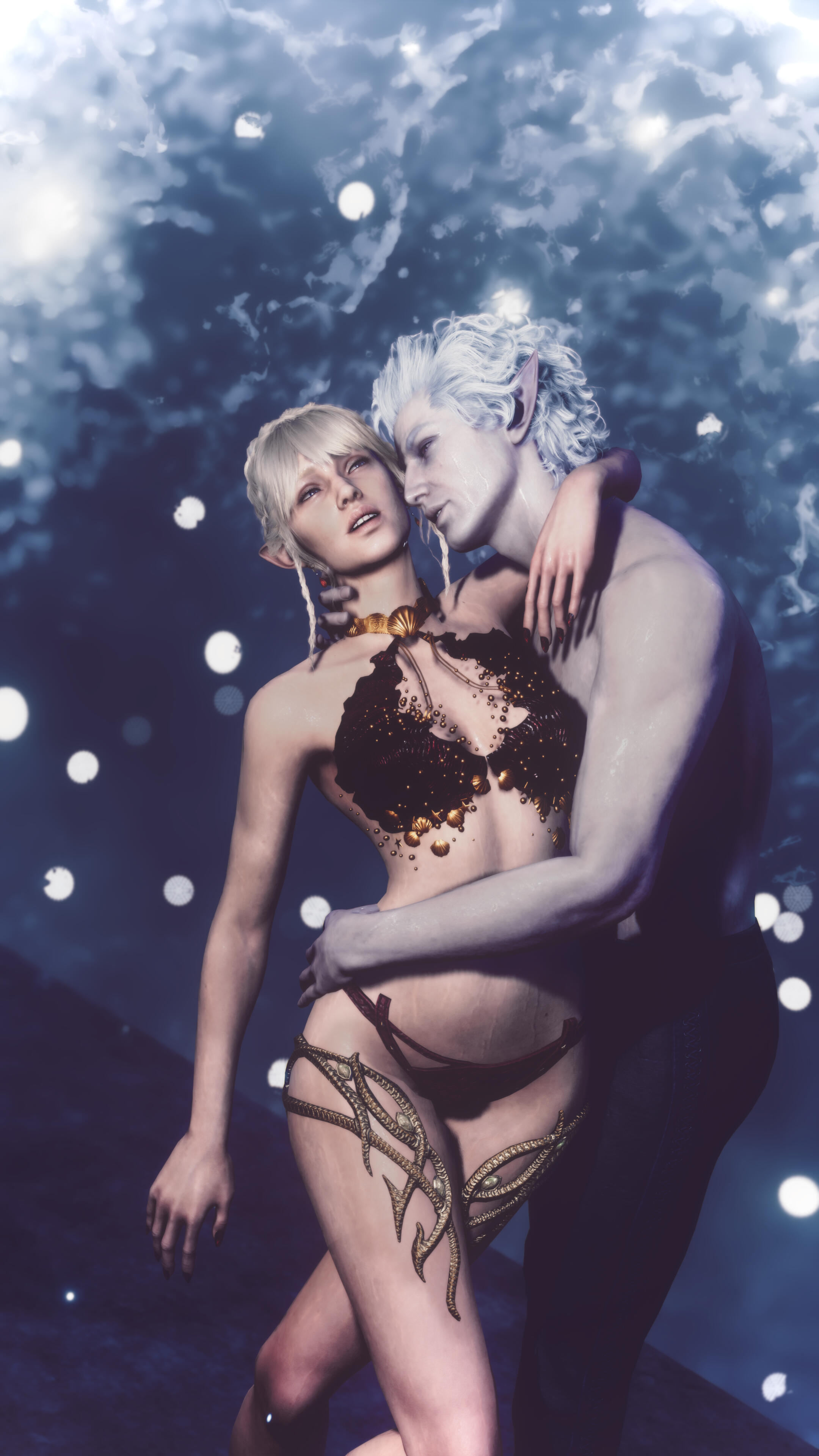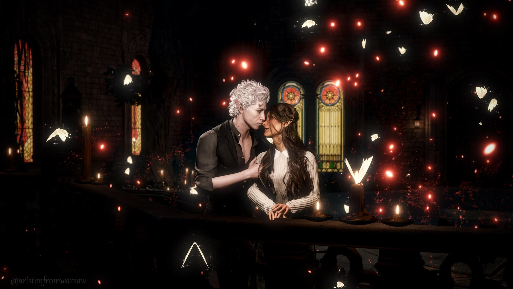 A new beginning (in-game events):Being a Bhaal's doll could have lasted for ages if not a certain incident. One day Aristen was kidnapped by a Mind Flayer's ship. She was infected with their tadpole and lost her memory. Luckily for her, there was a plane crash, which she miraculously survived and managed to escape. Now she had a new goal - to get rid of the tadpole and find out who she is. During her journey she learned the truth about her murderous origins. But she wasn't alone in this. Aristen met some loyal friends: Gale (a human wizard who was harmed by the goddess of magic, Mystra), Karlach (tiefling who, like Ari, was betrayed by the person she trusted), Lae'zel (githyanki who was deceived by her queen), Shadowheart (a priestess of Shar who rejected her goddess), Wyll (human Warlock who sacrificed a lot to save others), Halsin (an elf druid who likes to carve ducks from wood), Jaheira (half elf and High Harper) and Minsc (Jaheira's friend who considers his hamster to be his mentor). And even though everyone supported her, Aristen felt that they didn't fully understand her, they don't know what it means to be someone's puppet. Except for one person who had similar sins as her. A men who has been a plaything for the powerful vampire for over 200 years. That toy was Astarion, high elf, vampire spawn. At first, Aristen had mixed feelings towards him, but later she realized that they were two of a kind. He was the only one who truly understood her dark urge and he truly was not afraid of her. They fell in love with each other.One night the urge to kill become strong and Aristen had mighty desire to kill Astarion. Resisting her whisperings, she decided to do everything to save him. Aristen woke him up and asked him to tie her up. She felt that after such an incident the vampire would break up with her. Who would want a partner who could kill you in the middle of the night ? But no, Astarion didn't break up with her, he was with her all night, watching over her. He wasn't even mad at her. He didn't see her as a monster, but only as a normal person who had been wronged by fate - she saw him the same way. Thanks to Astarion, everything became easier and impossible things became possible.